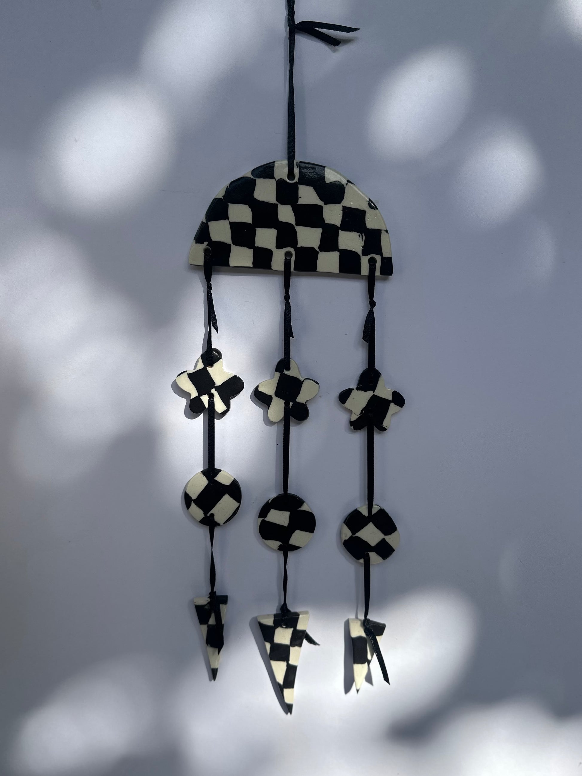 Black and white clay slowly cut and then arranged into checkered pattern before being cut and fired. Shapes arranged and connected with black ribbon