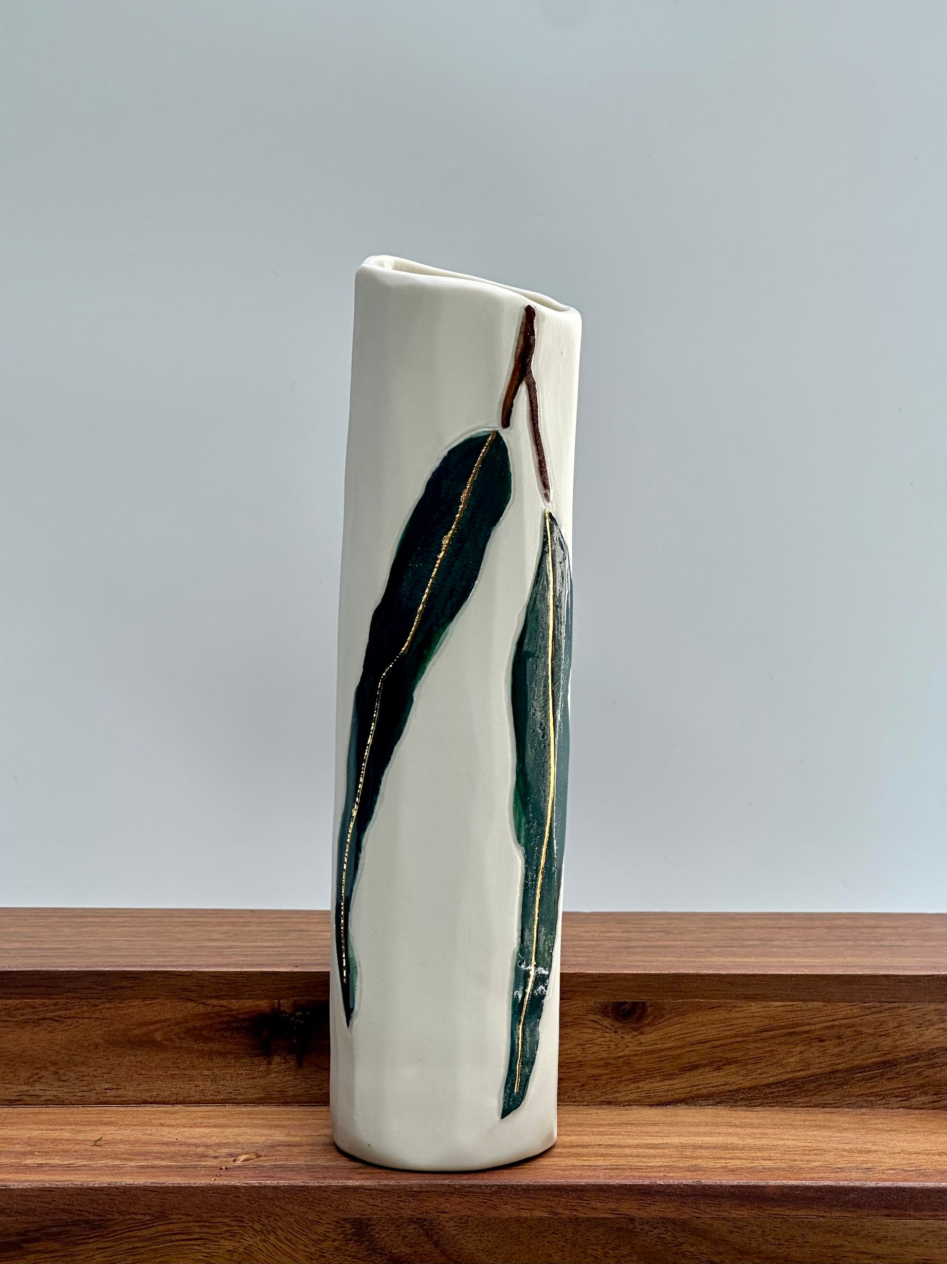 Faceted white porcelain vases, sgraffito eucalyptus leaves touched with gold lustre