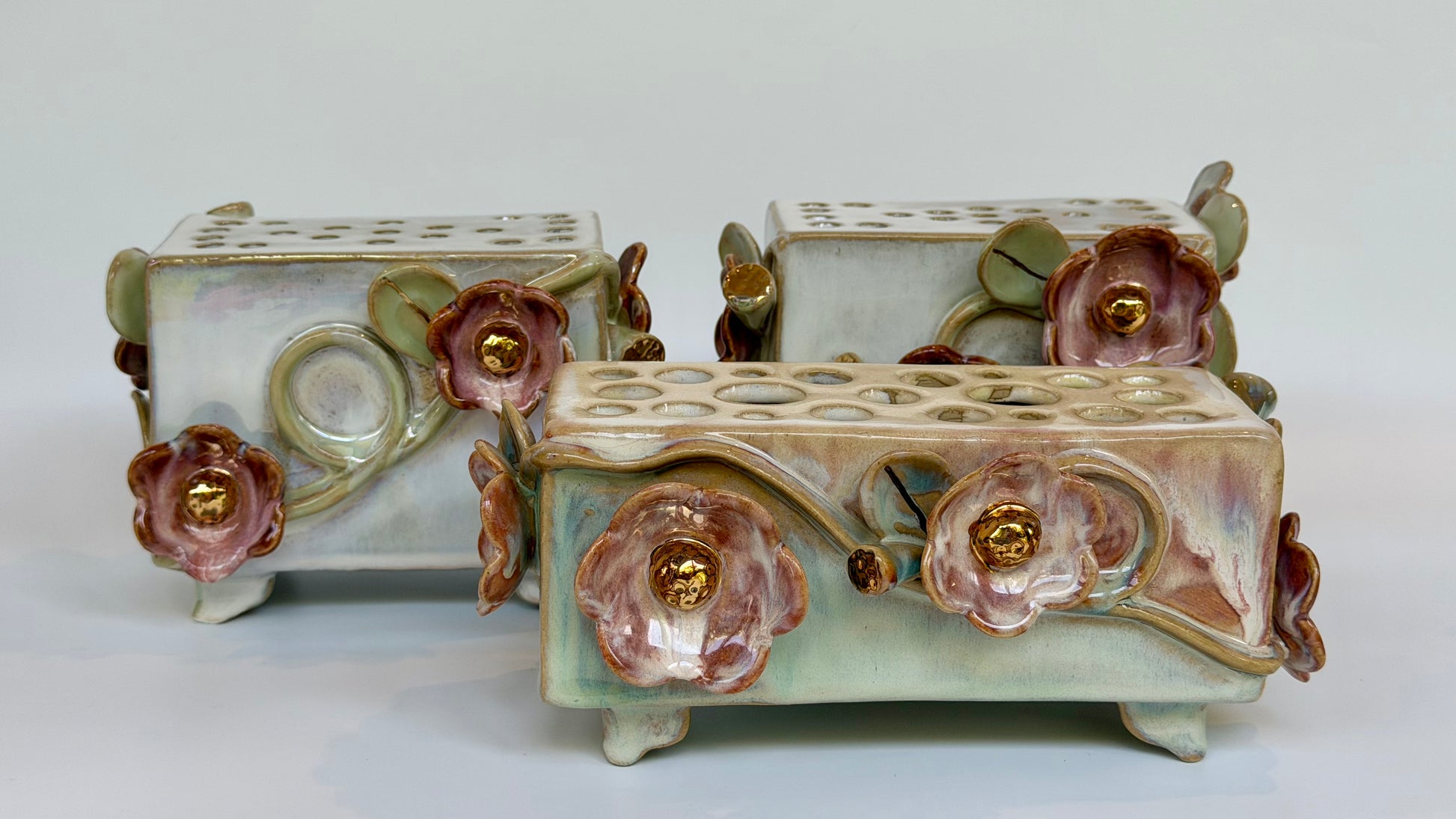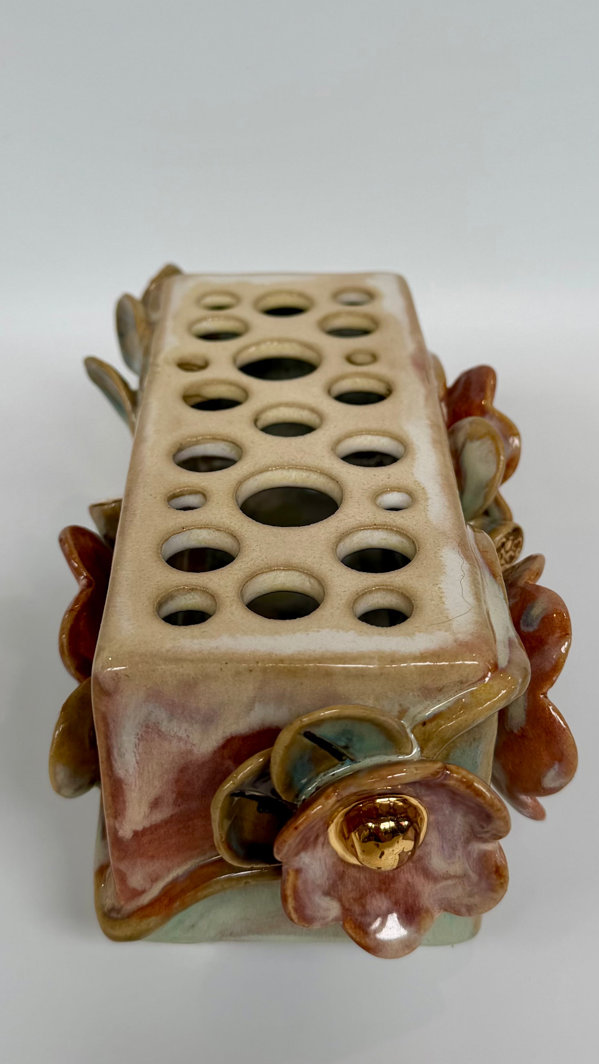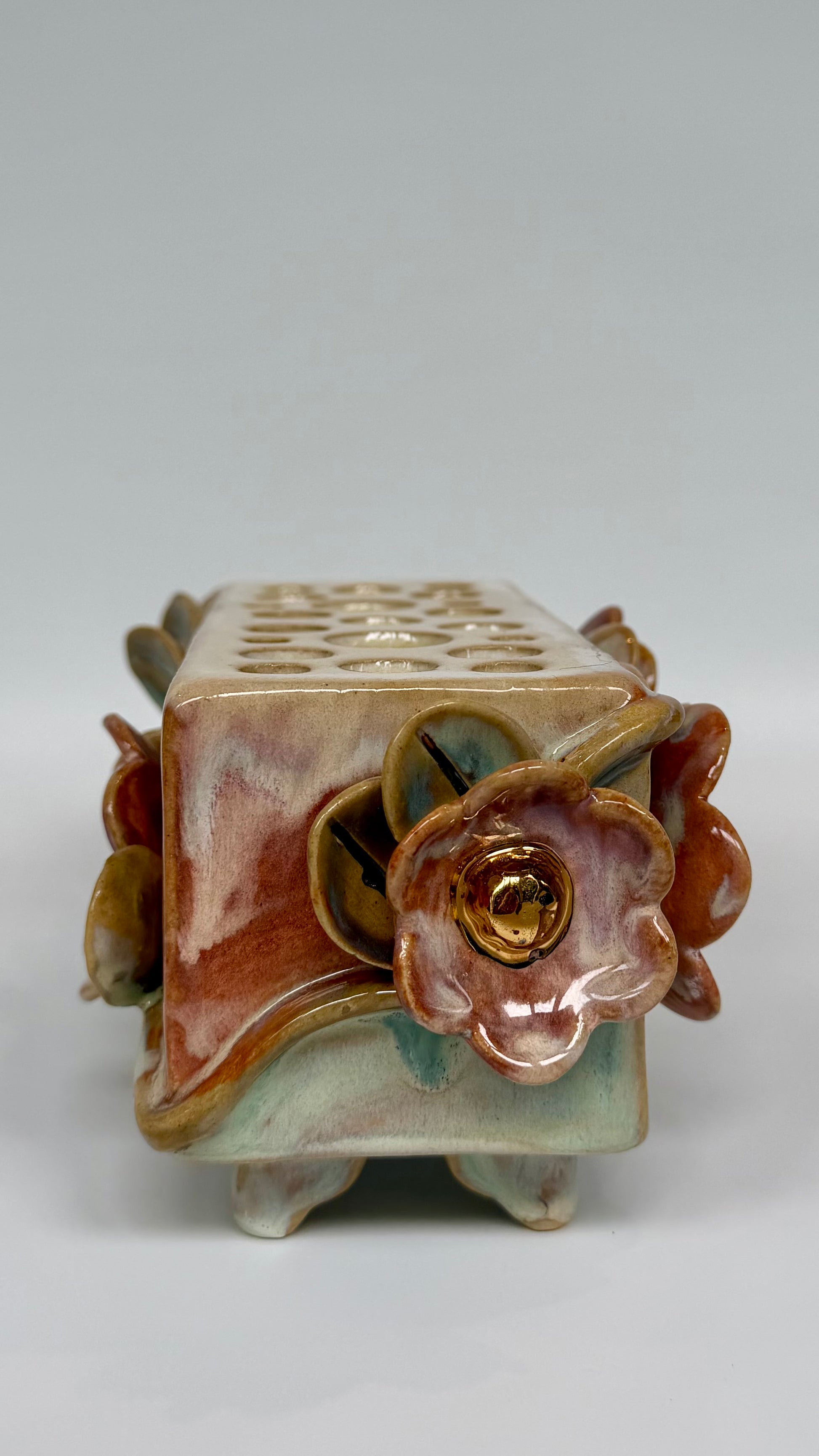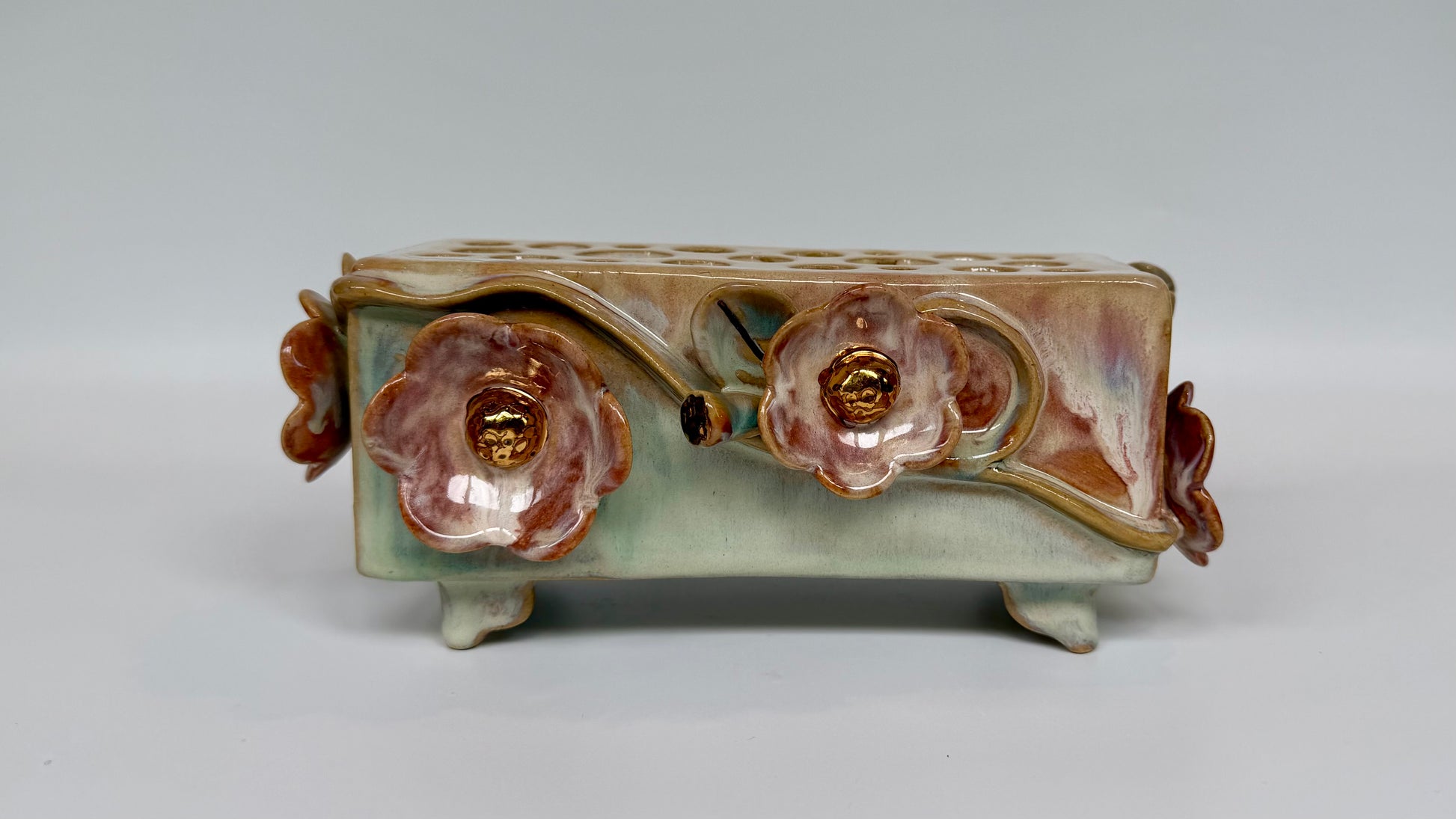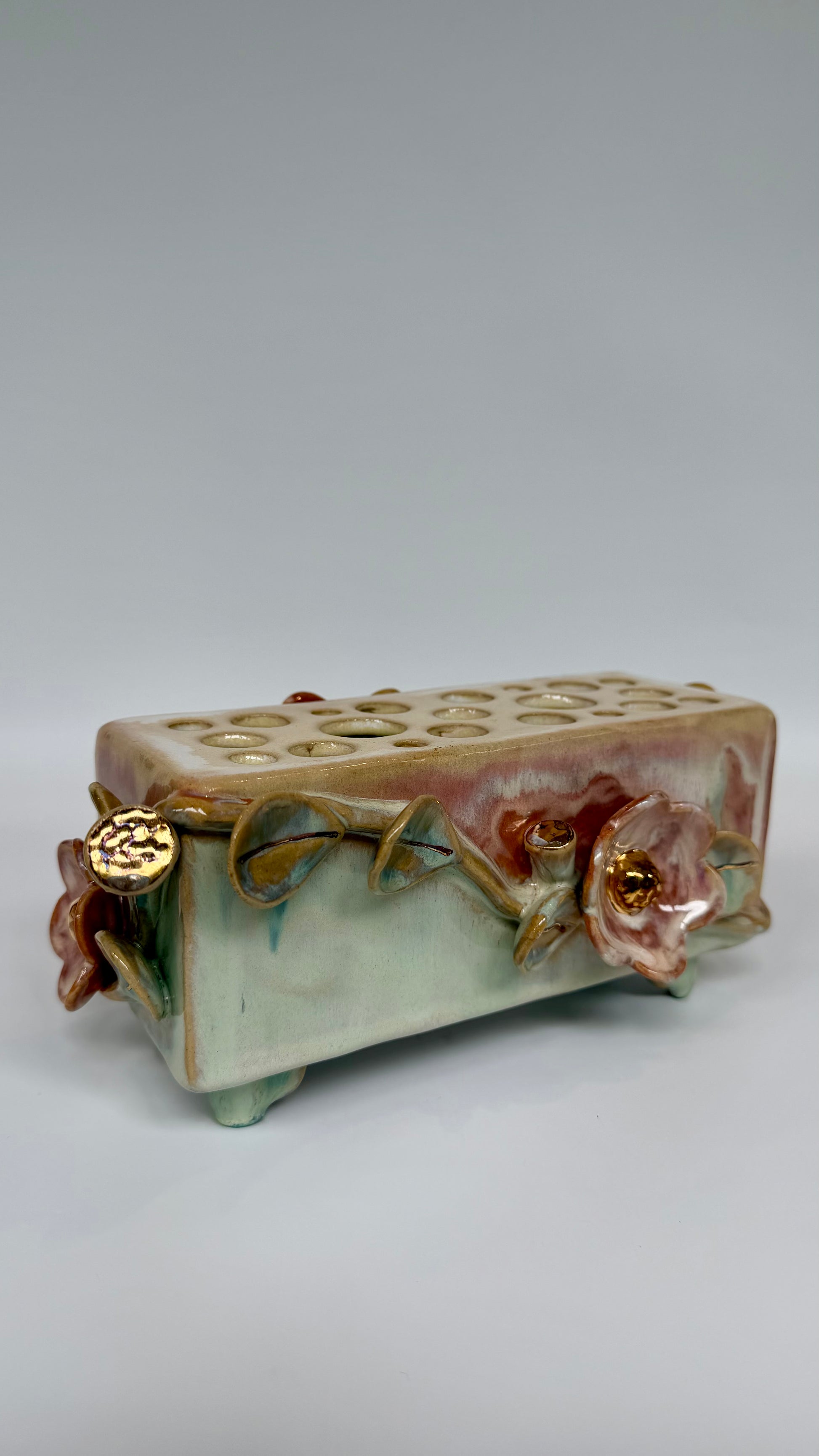 This large rectangle flower brick floats on four little feet, green and pink glazes bring the sculptural elements to life. Gold lustre highlights the blooms and leaves. Made to be beautiful both with or without flowers.