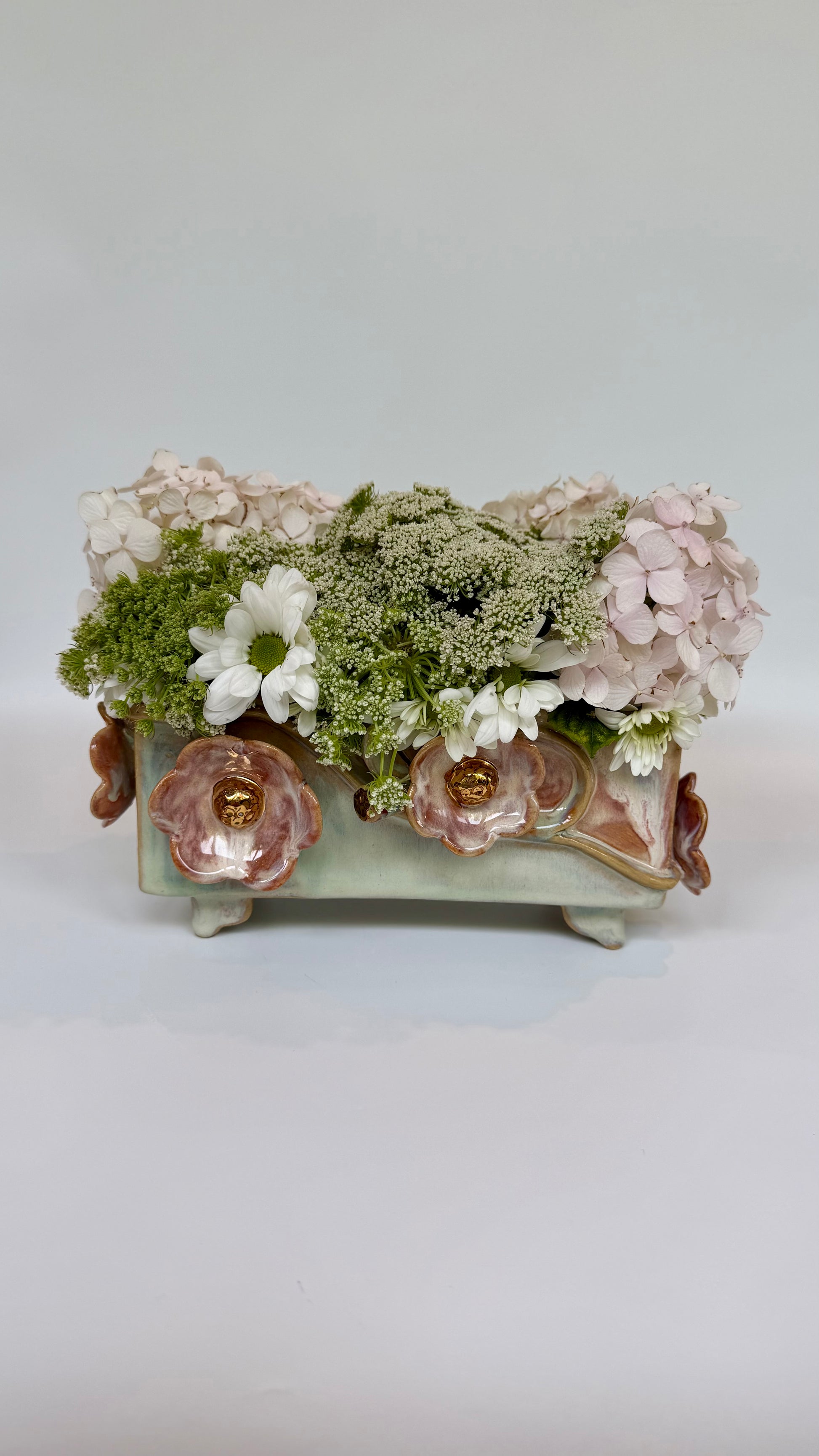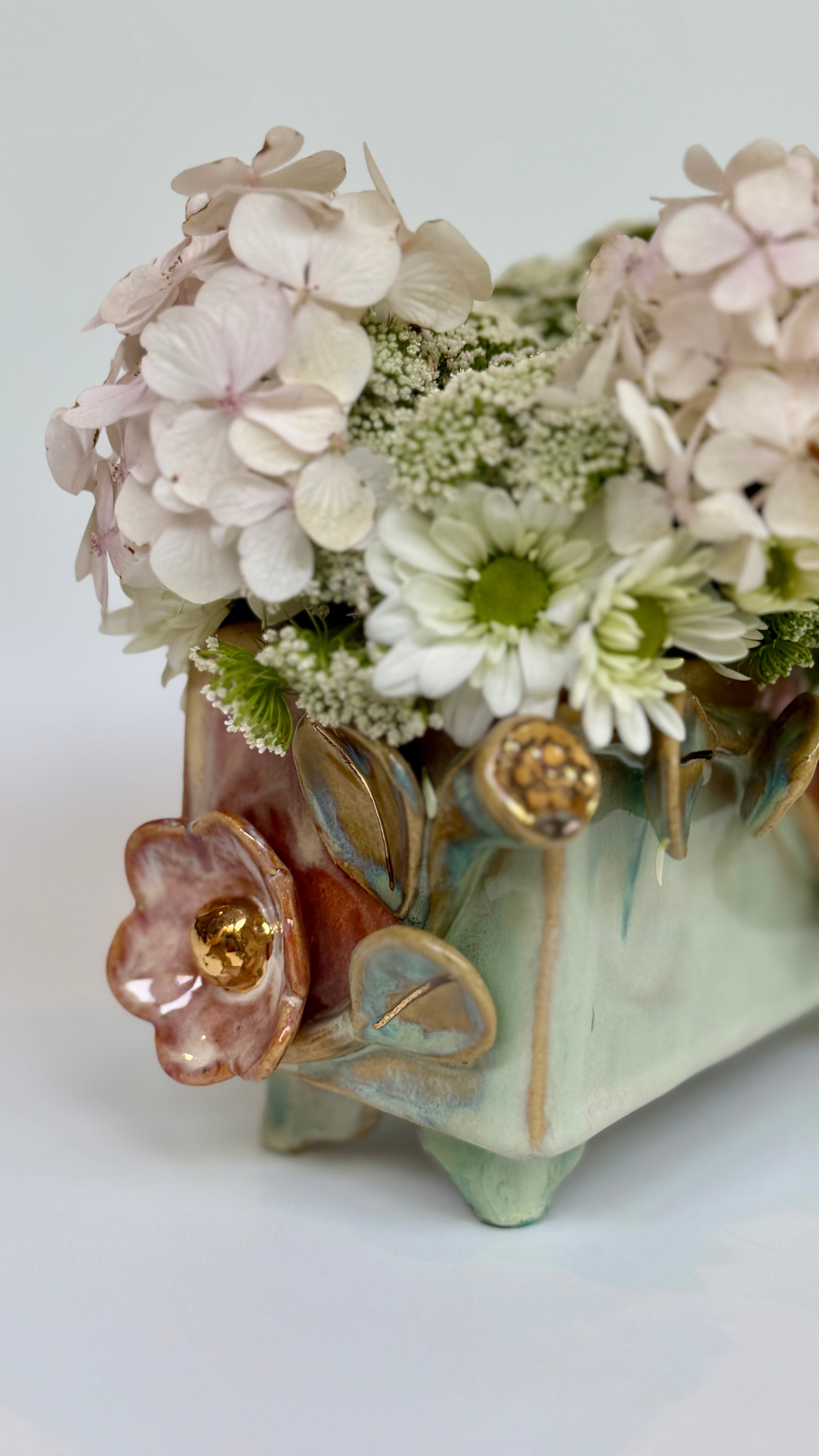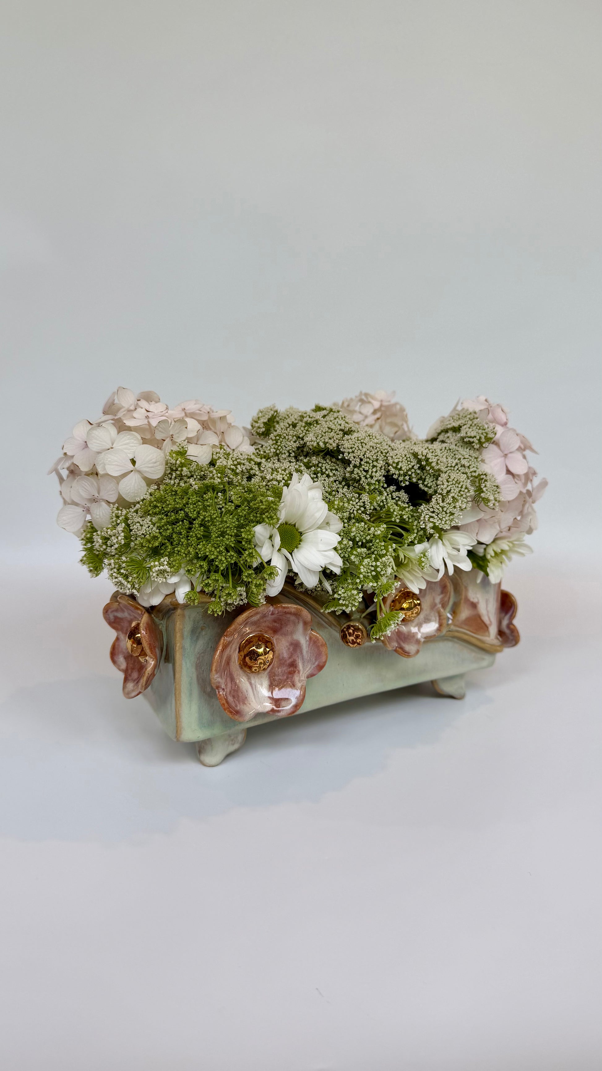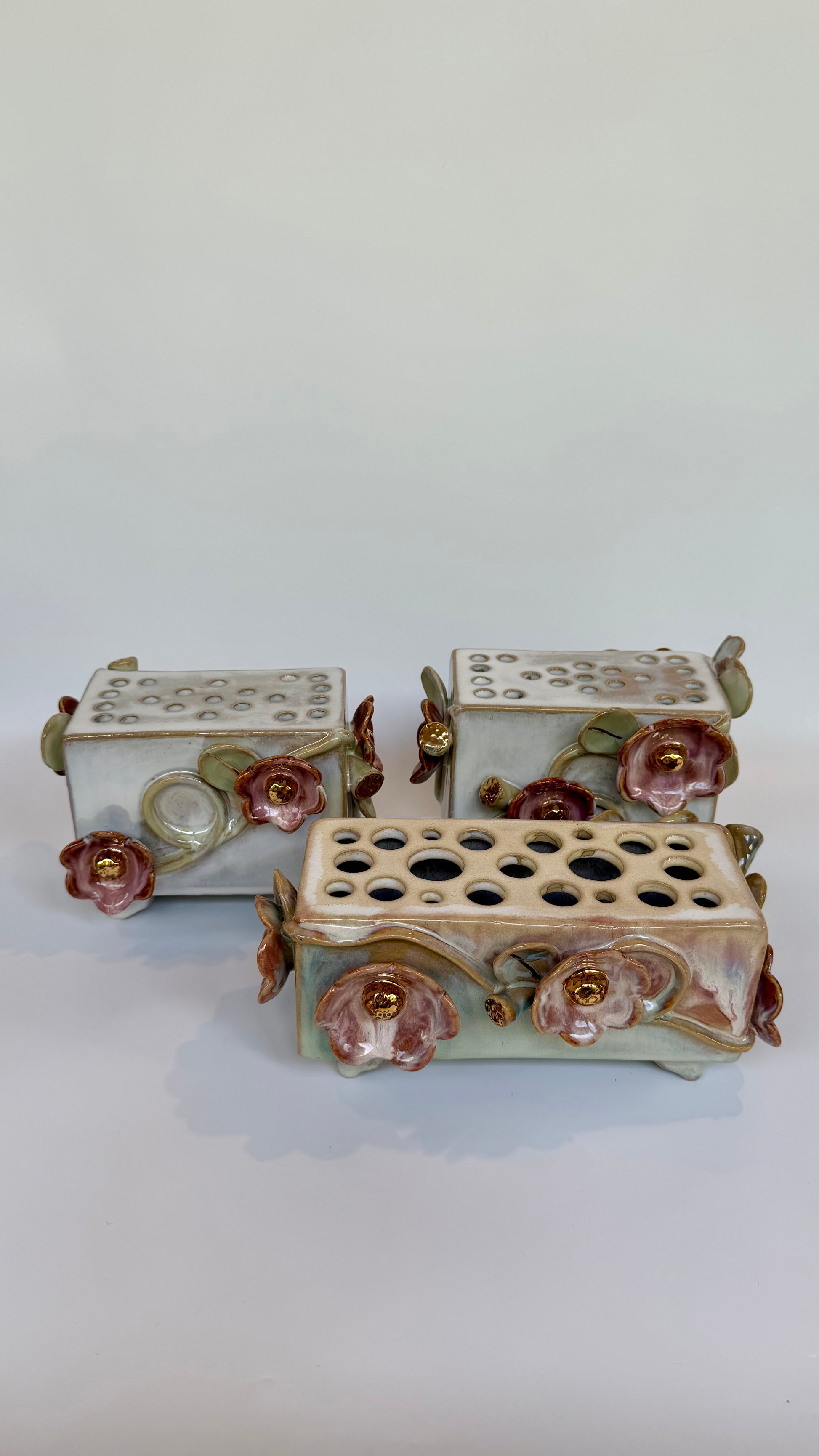 This large rectangle flower brick floats on four little feet, green and pink glazes bring the sculptural elements to life. Gold lustre highlights the blooms and leaves. Made to be beautiful both with or without flowers.