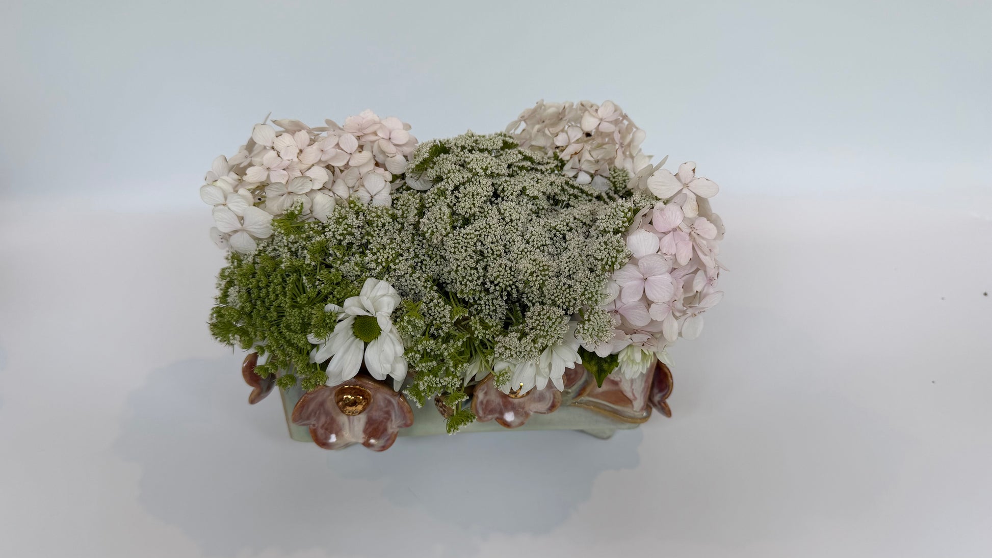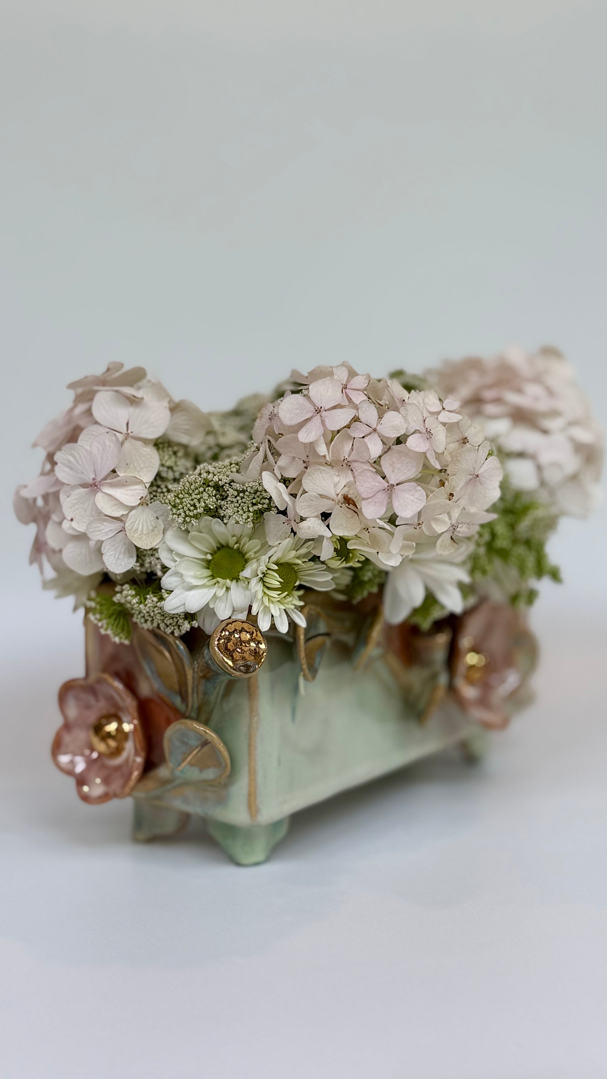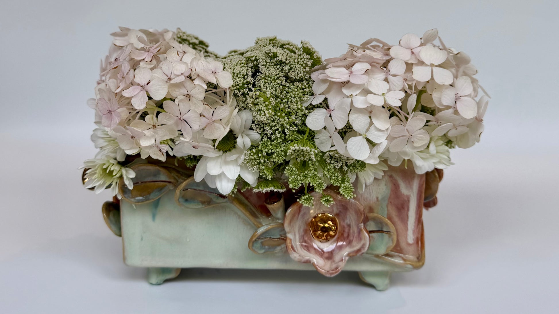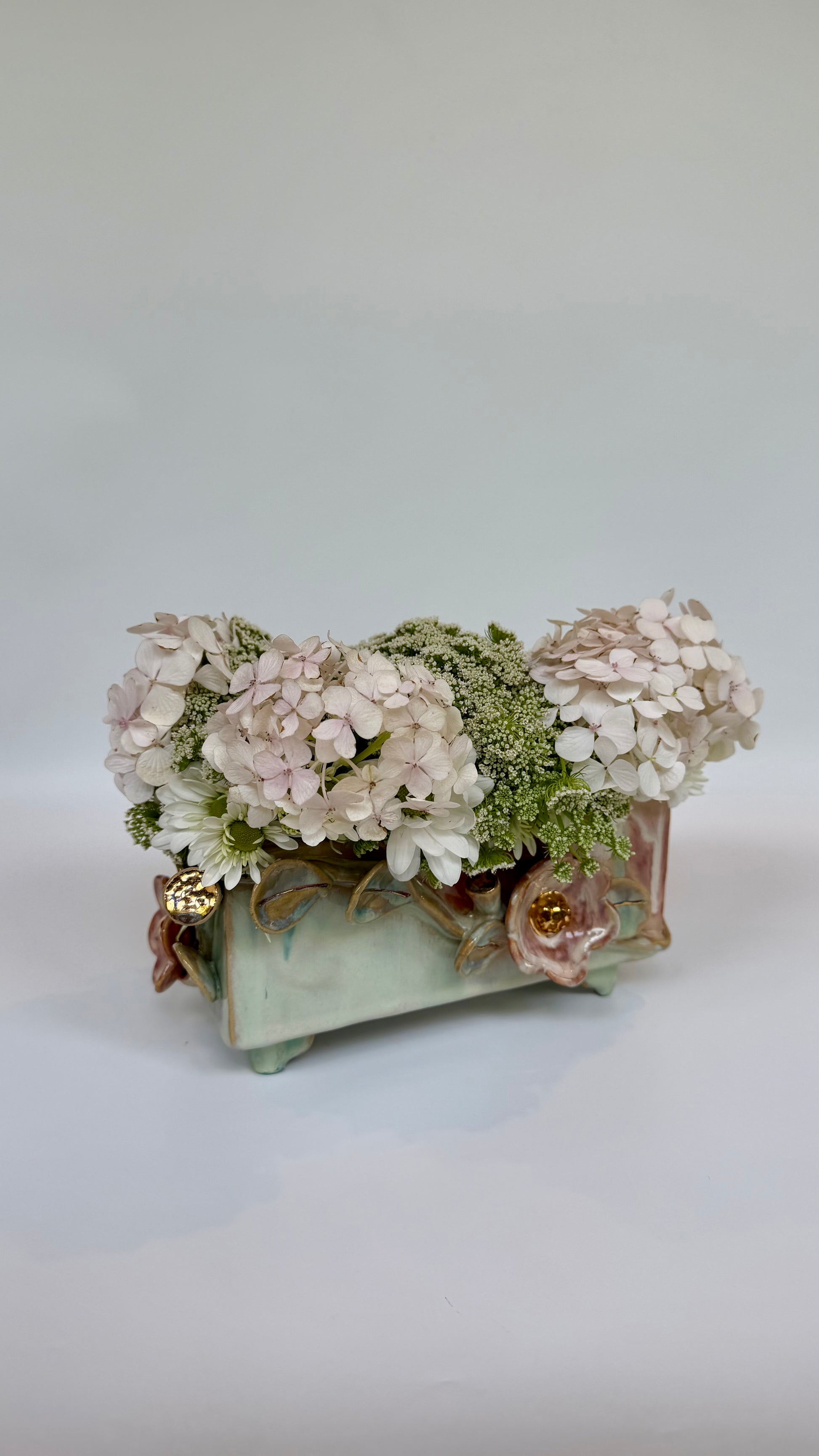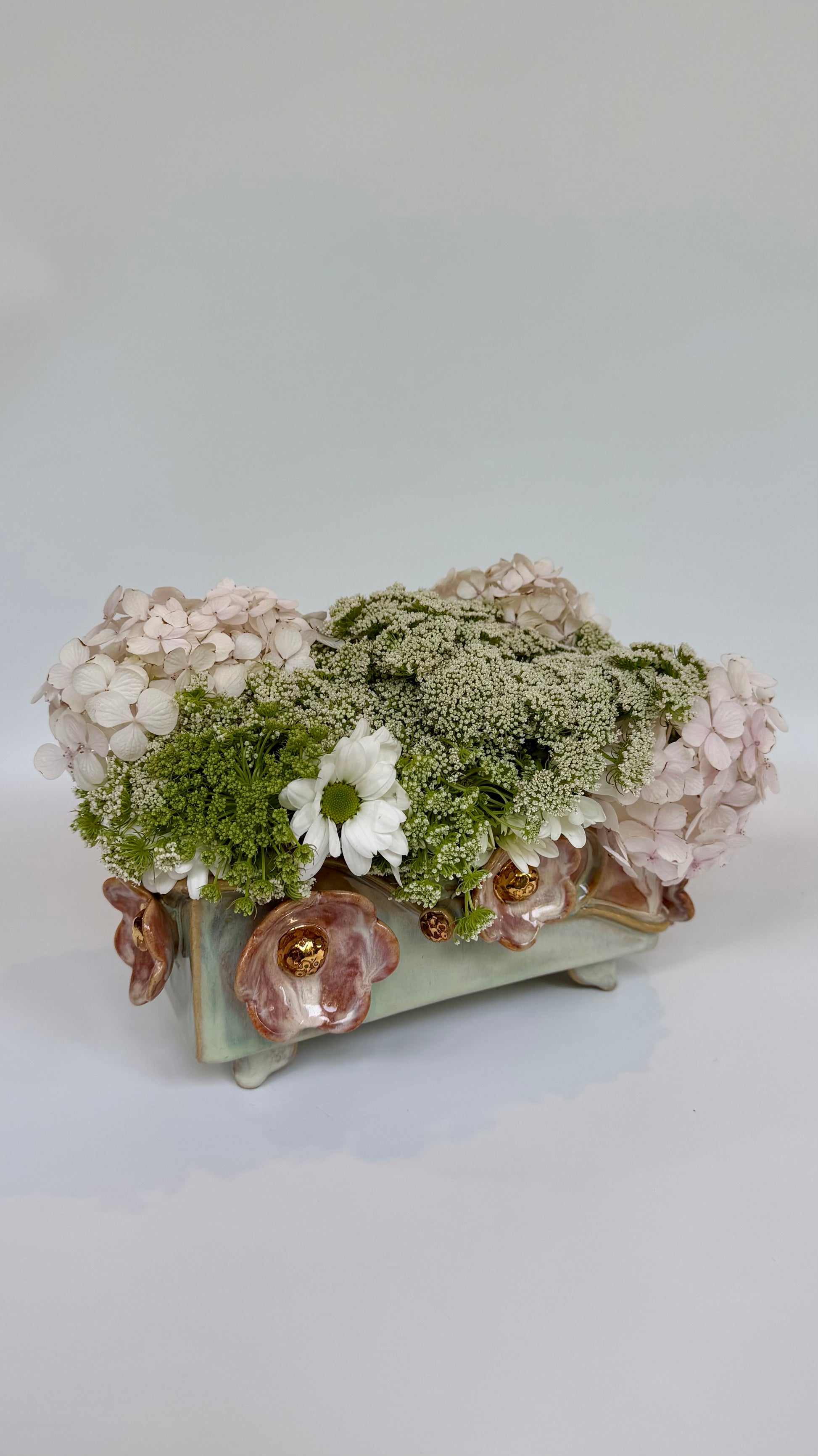 This large rectangle flower brick floats on four little feet, green and pink glazes bring the sculptural elements to life. Gold lustre highlights the blooms and leaves. Made to be beautiful both with or without flowers.