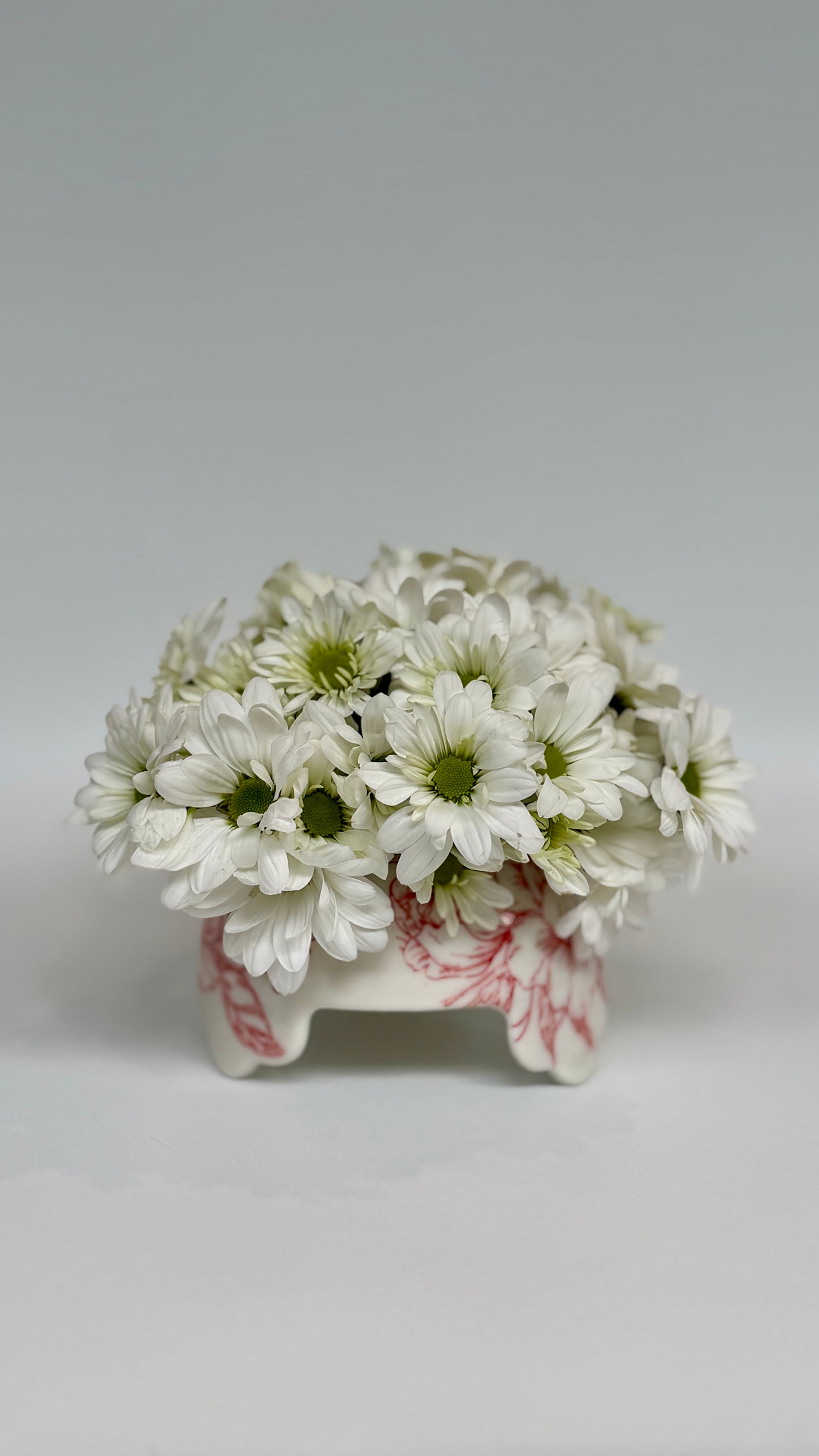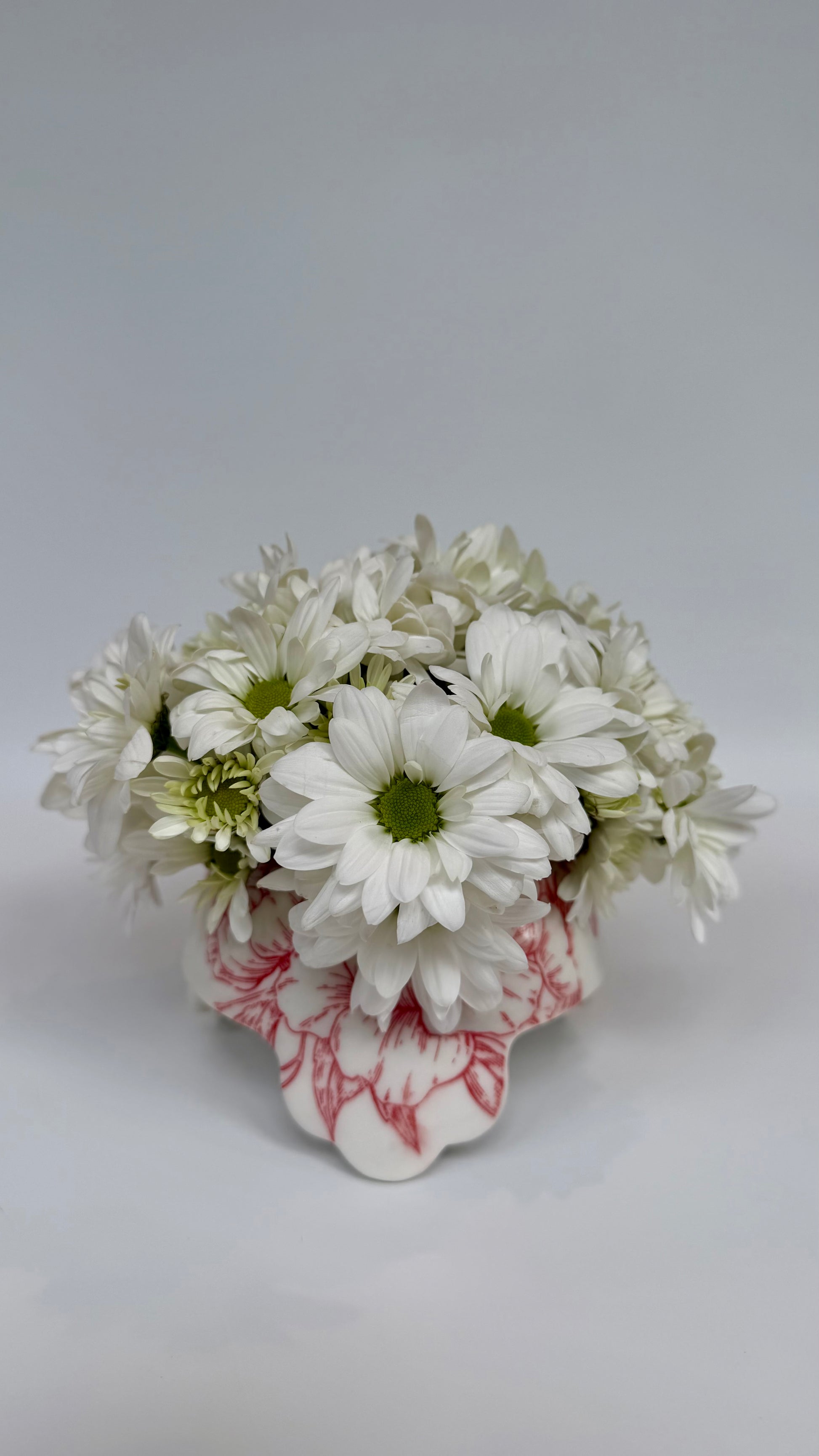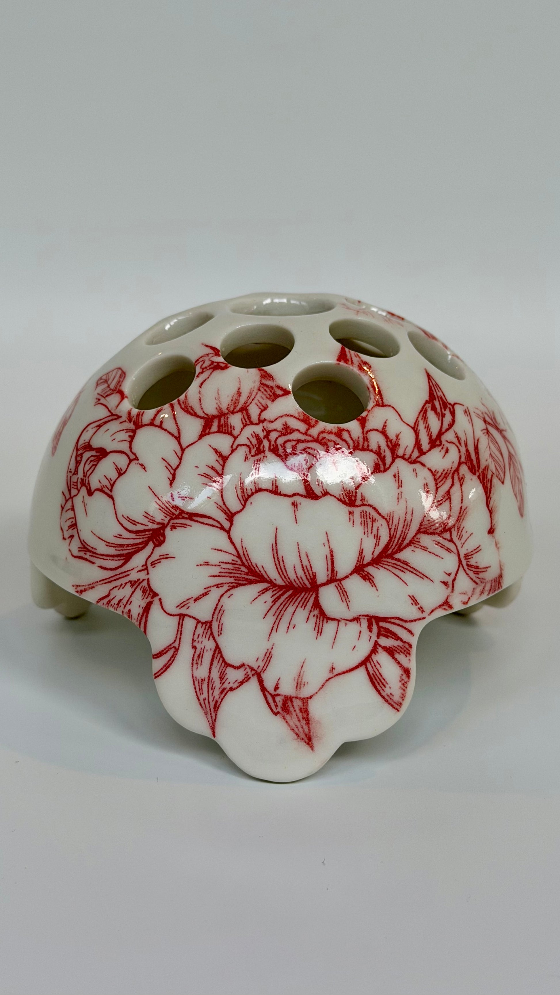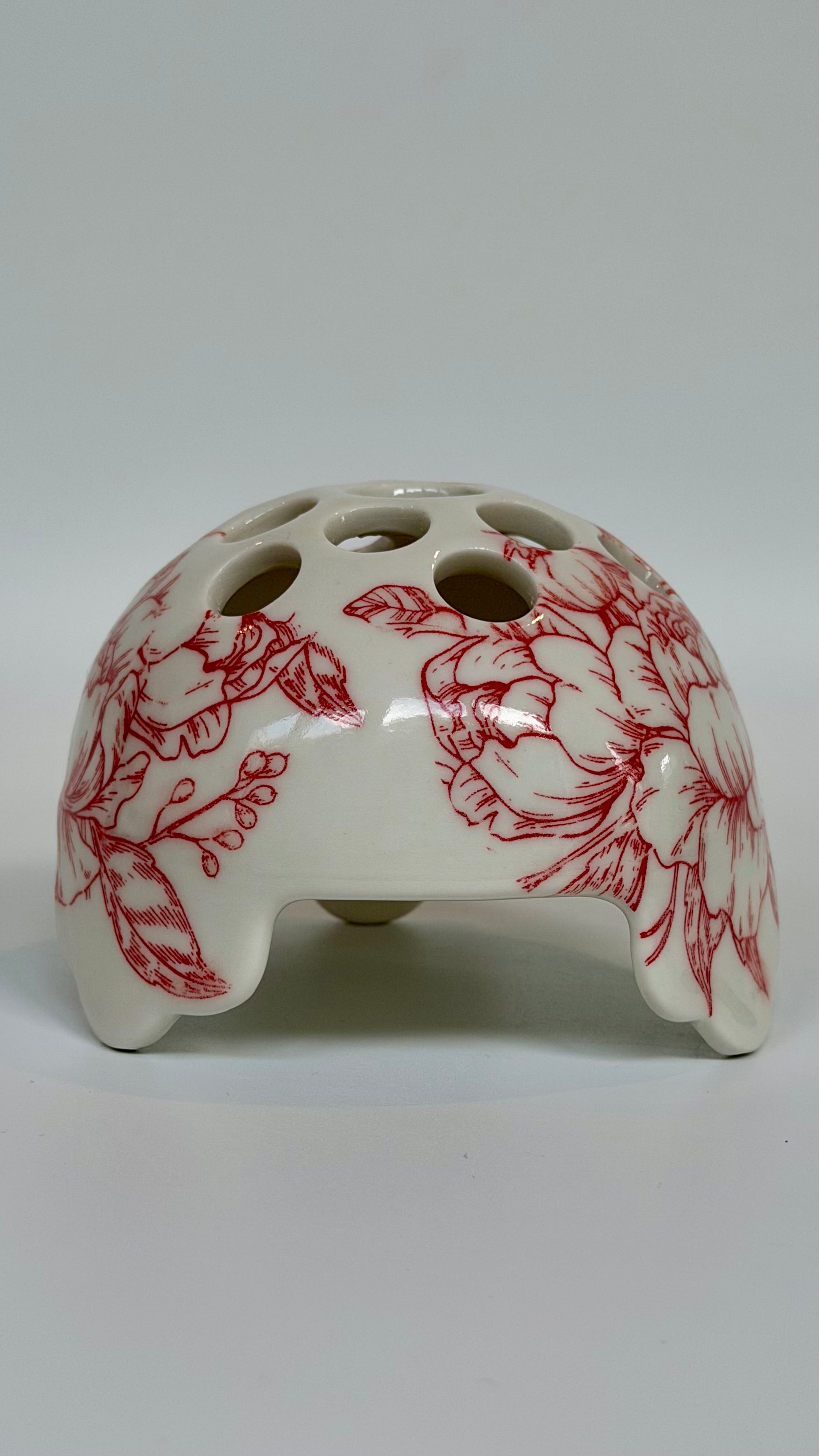 Porcelain flower frog adorned with red rose underglaze pattern evokes a touch of romance. Made to be enjoyed in your home both with or without flowers.