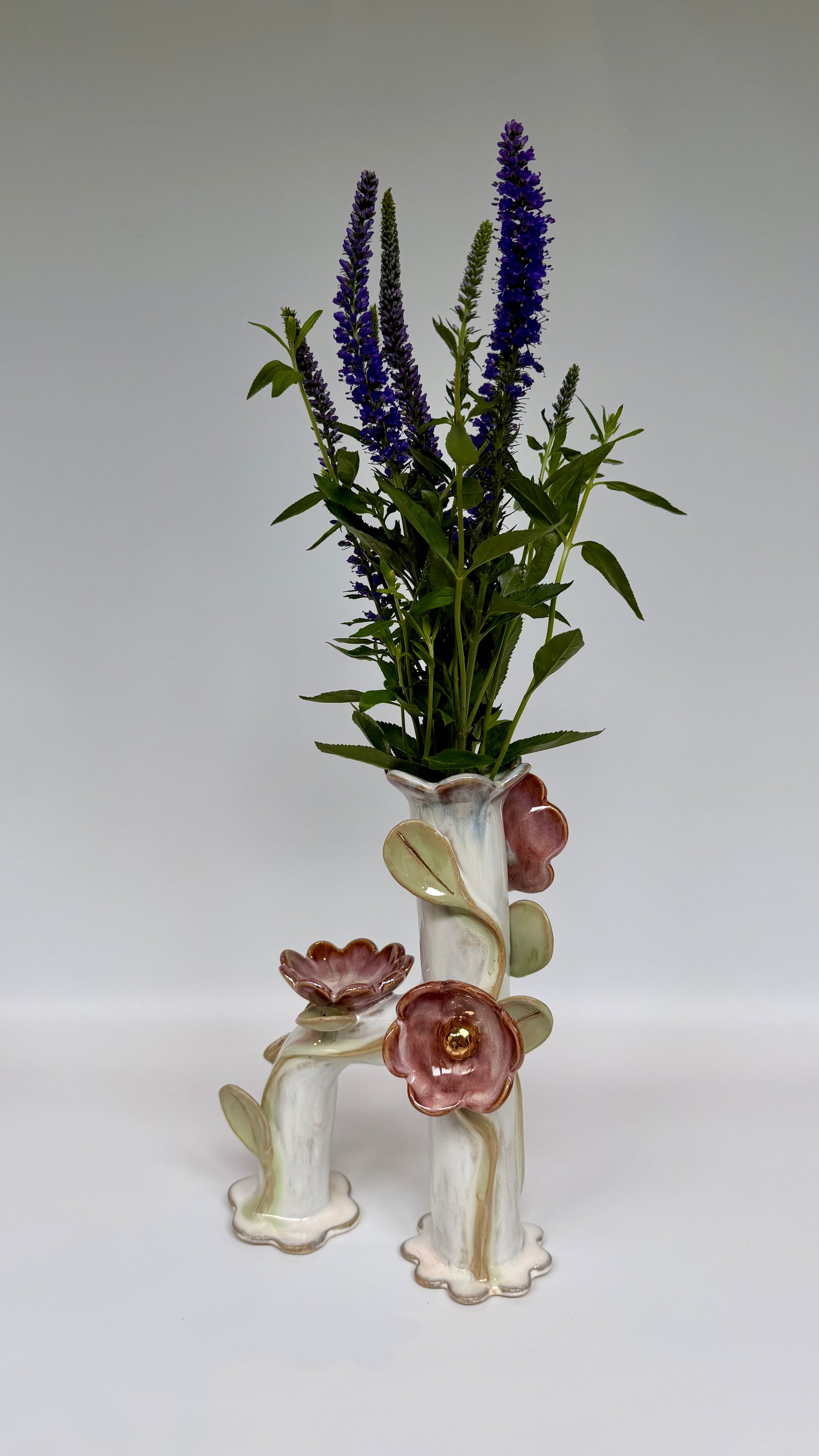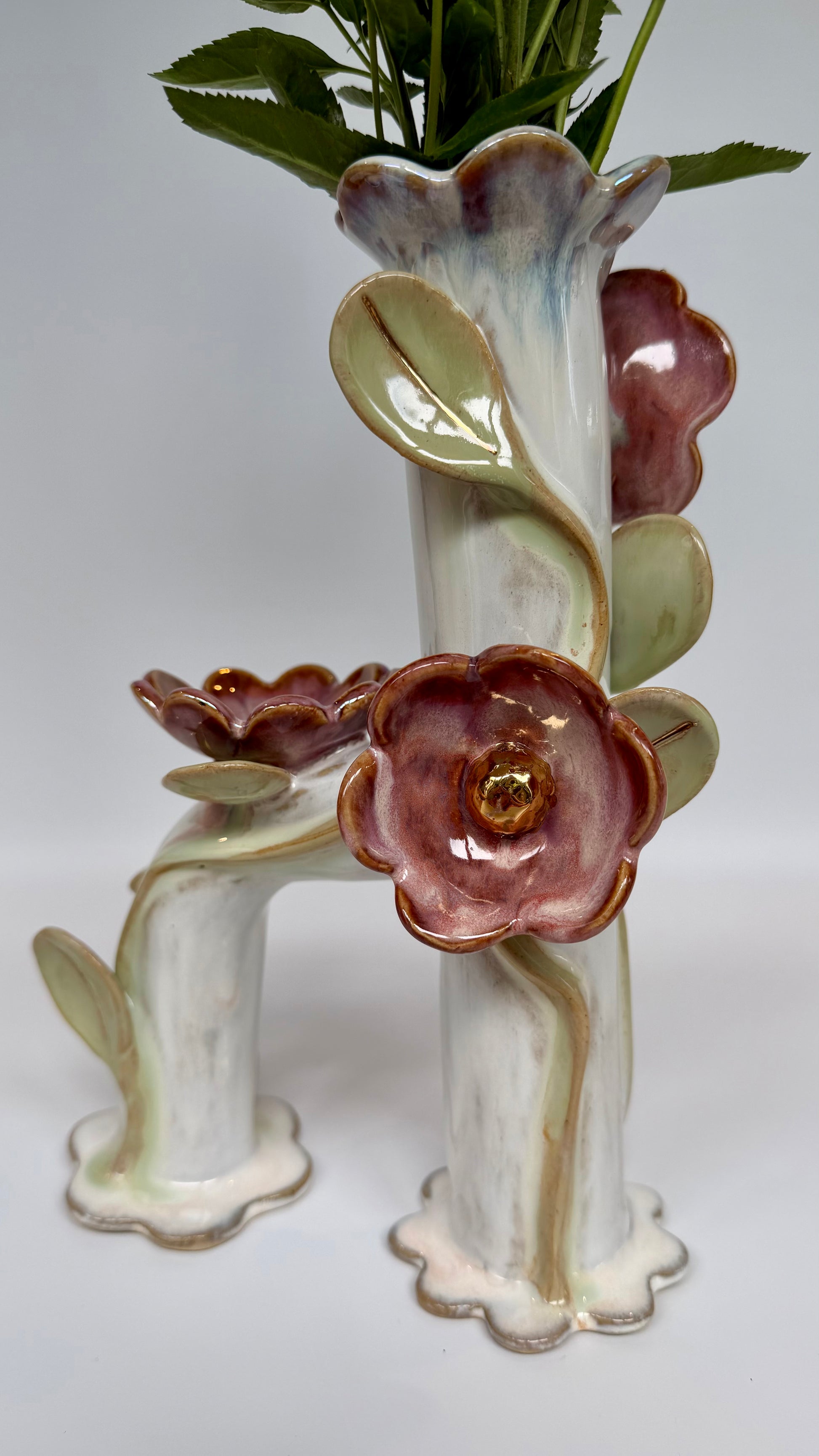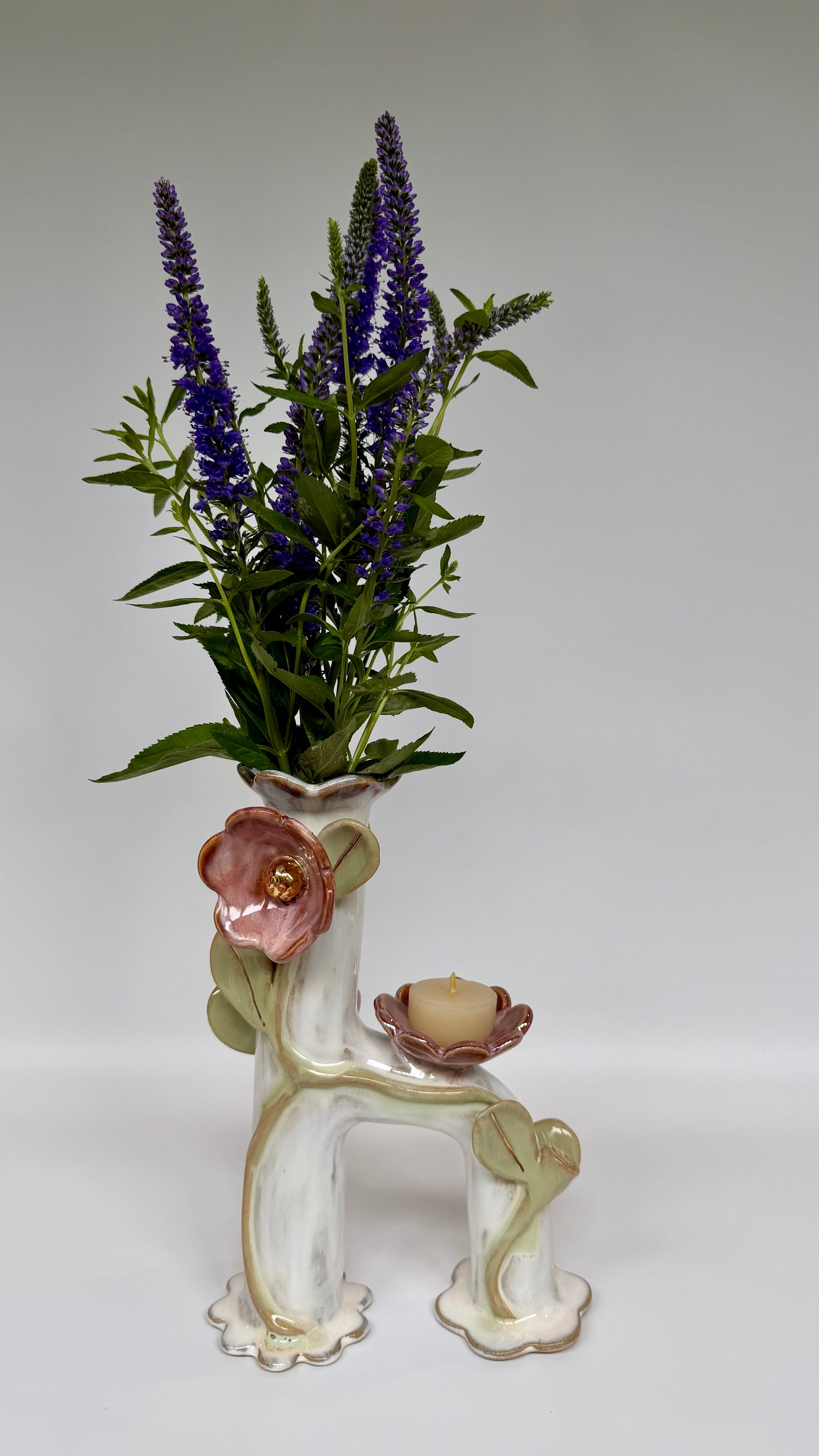 Ceramic flowers encircle the main vase, providing a beautiful view from all angles. The tea light candle holder creates a warm glow for its flower companions. Delicate pink and green glazes highlight the flowers and leaves, blooms then accented with gold lustre and mother of pearl.