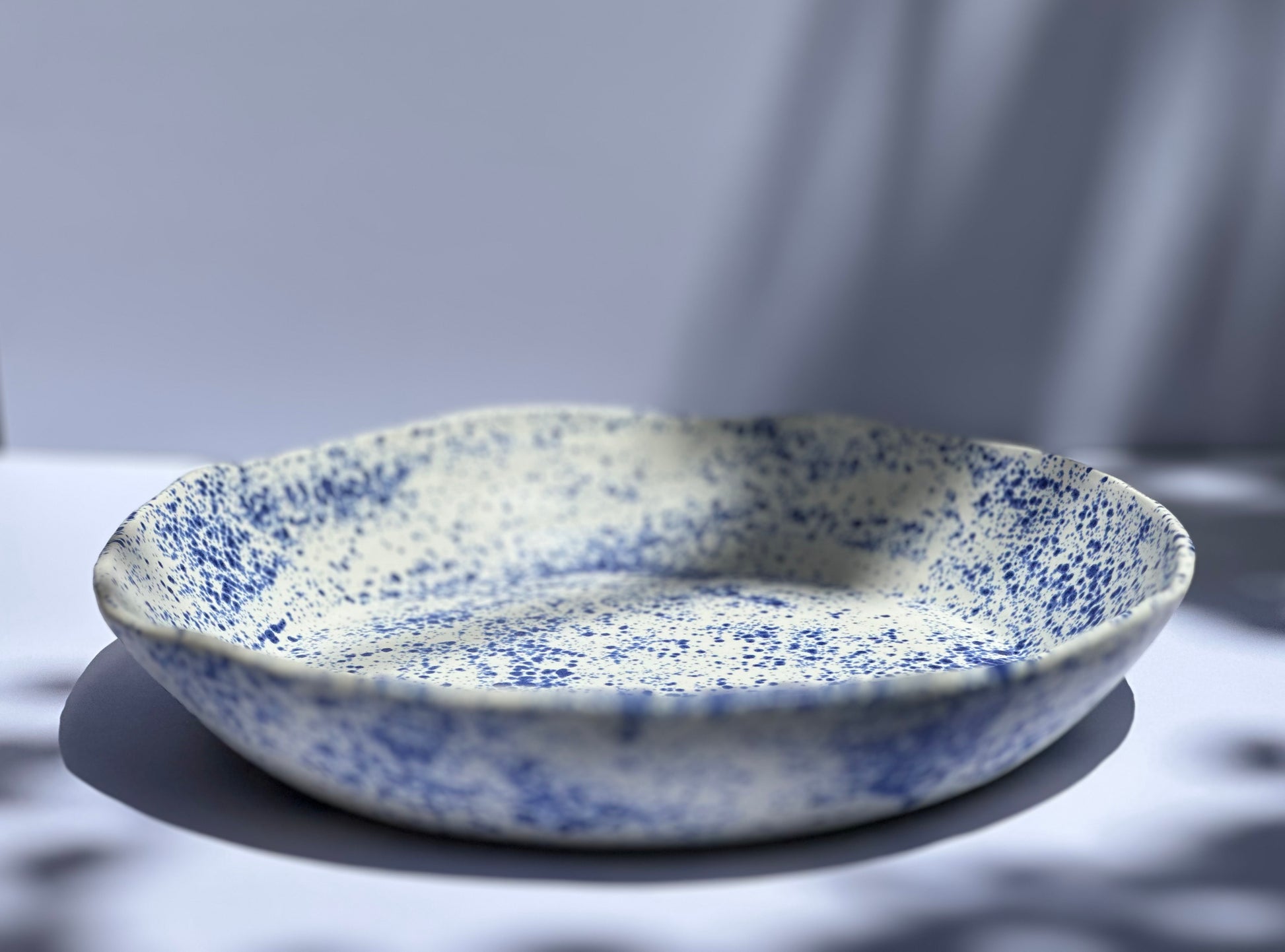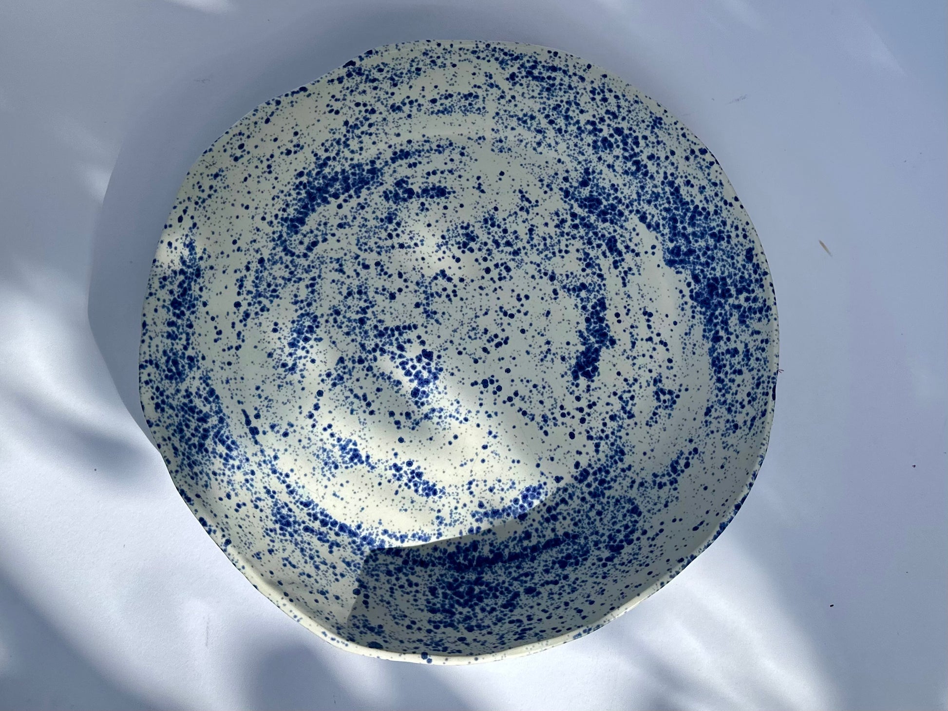 Extra large fruit or salad bowl in blue and white speckled glaze