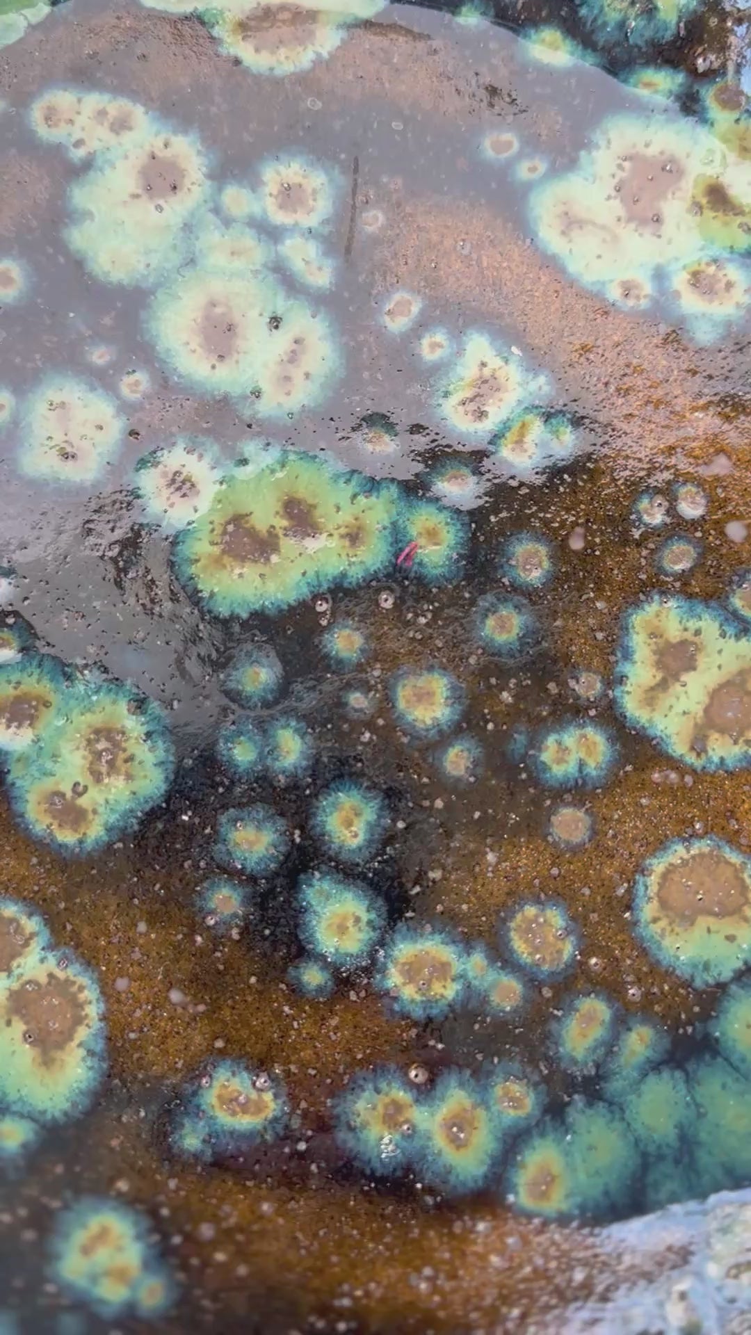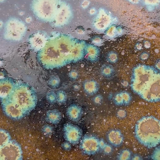 This green and blue glazed bowl in dark speckled clay creates a mesmerising pool like effect
