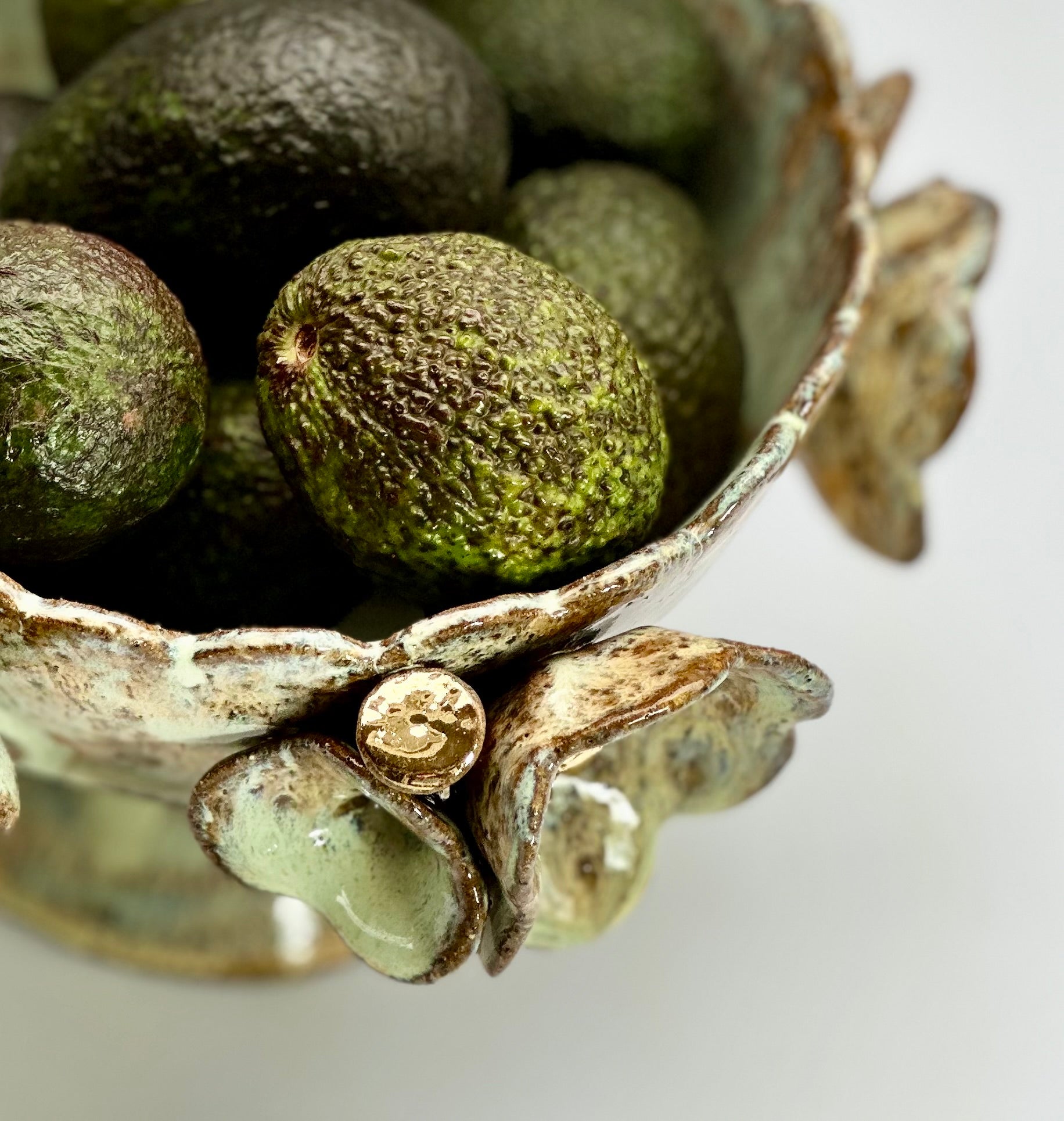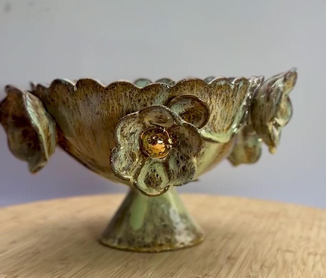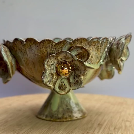 Falling light greens melt into this dark speckled clay. Medium pedestal bowl with flowers, leaves and vines accented with gold luster