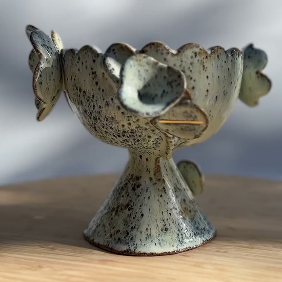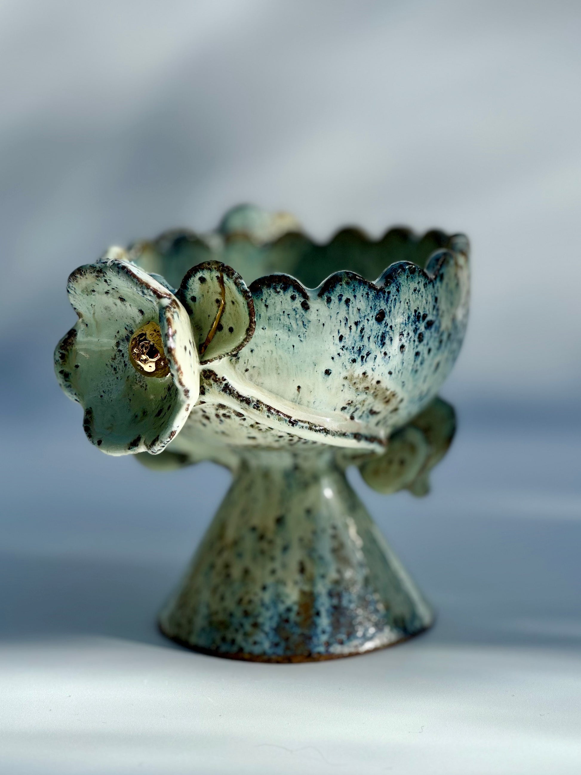 Falling light greens melt into this dark speckled clay. Medium pedestal bowl with flowers, leaves and vines accented with gold luster