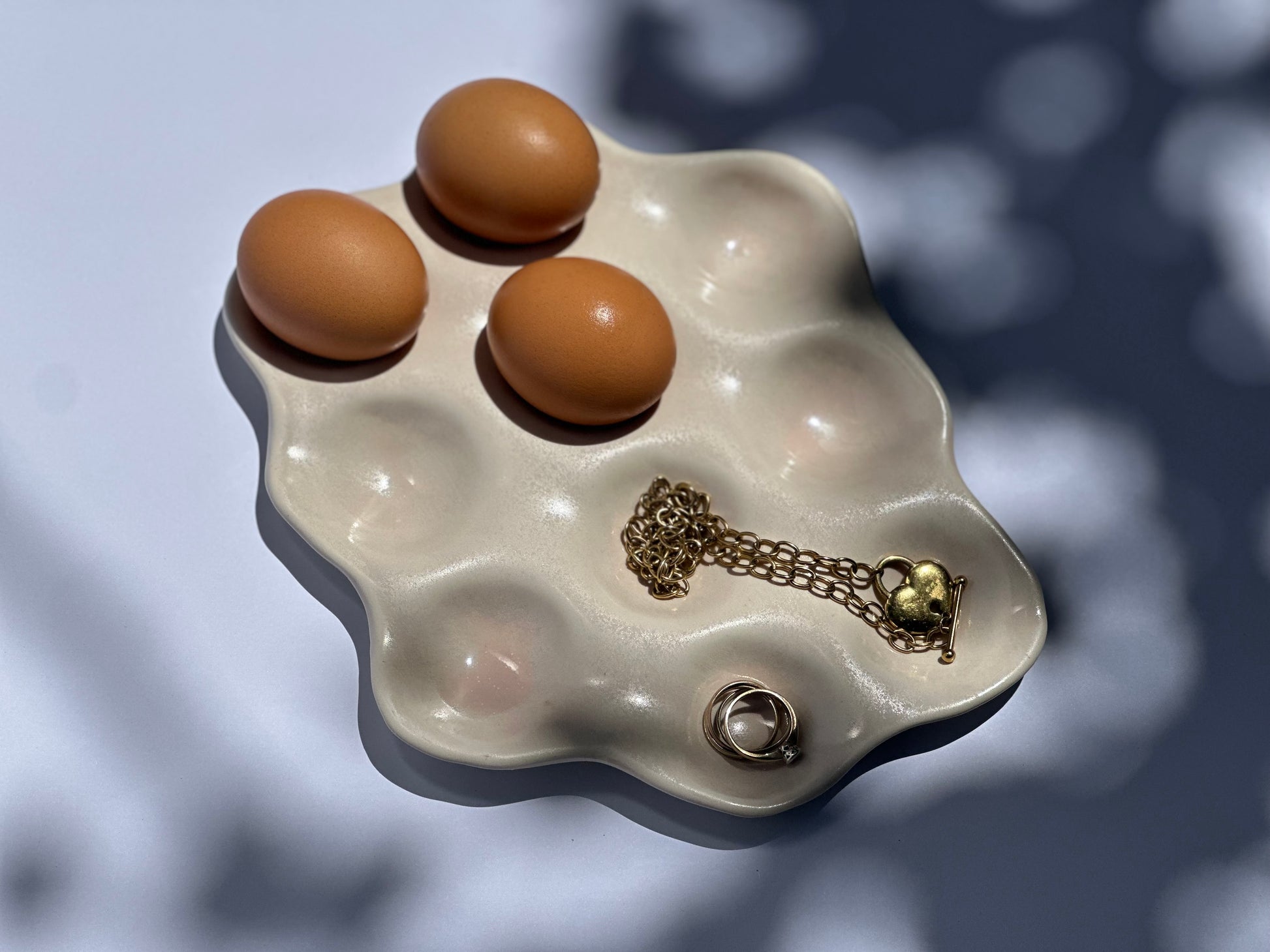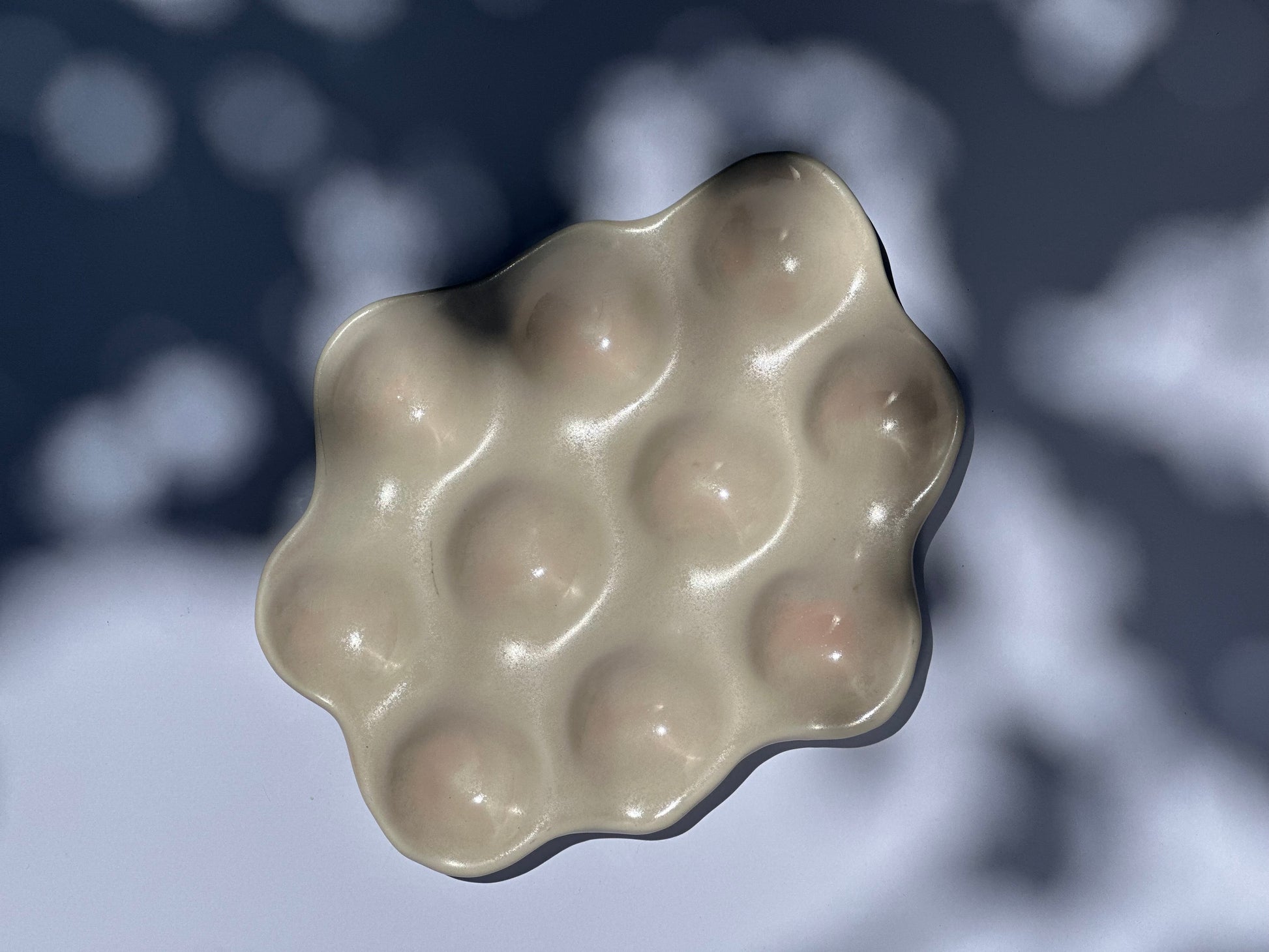 Organic shaped nesting tray in soft pink glaze, pooling darker pink in the base of the nests