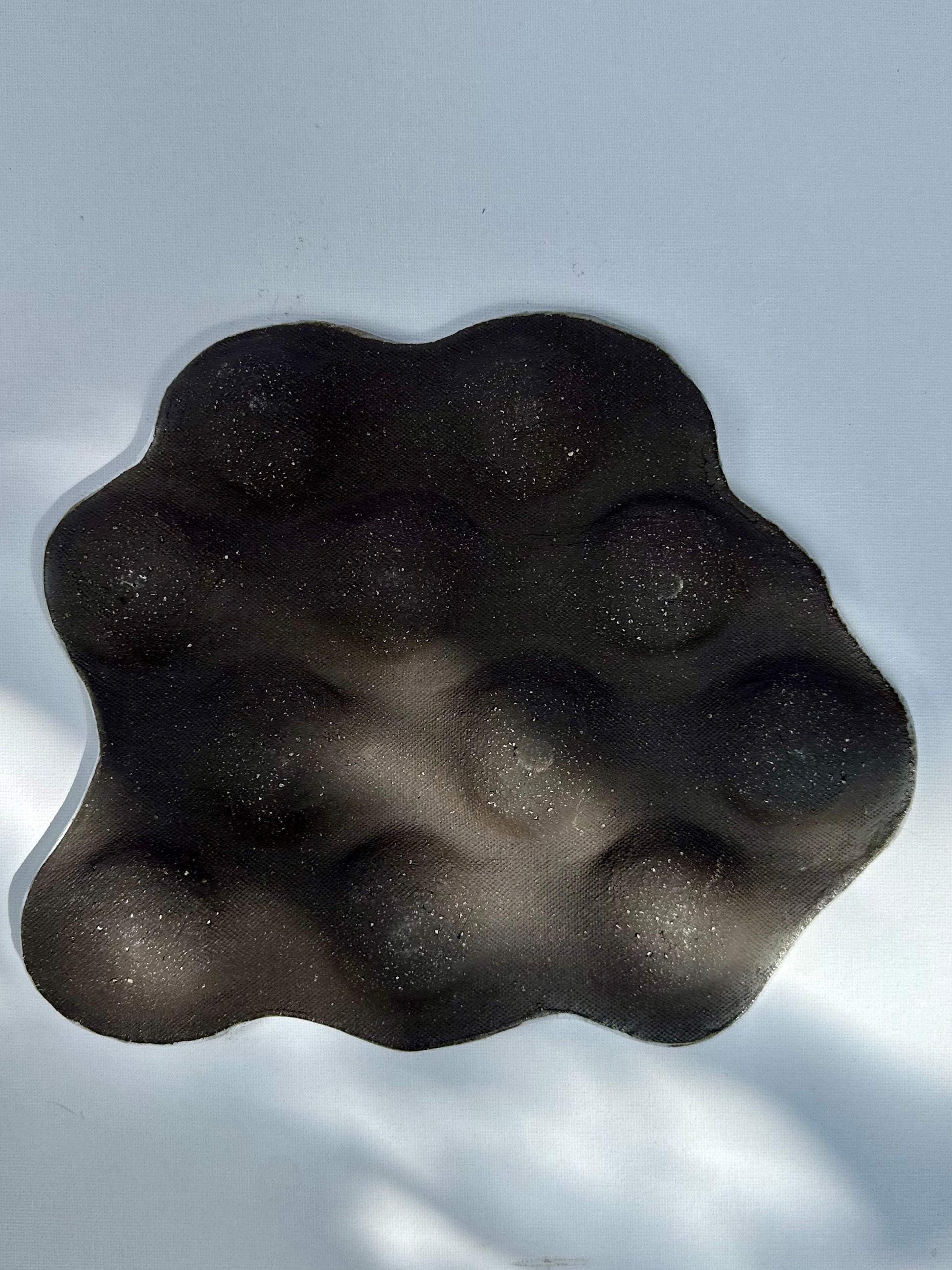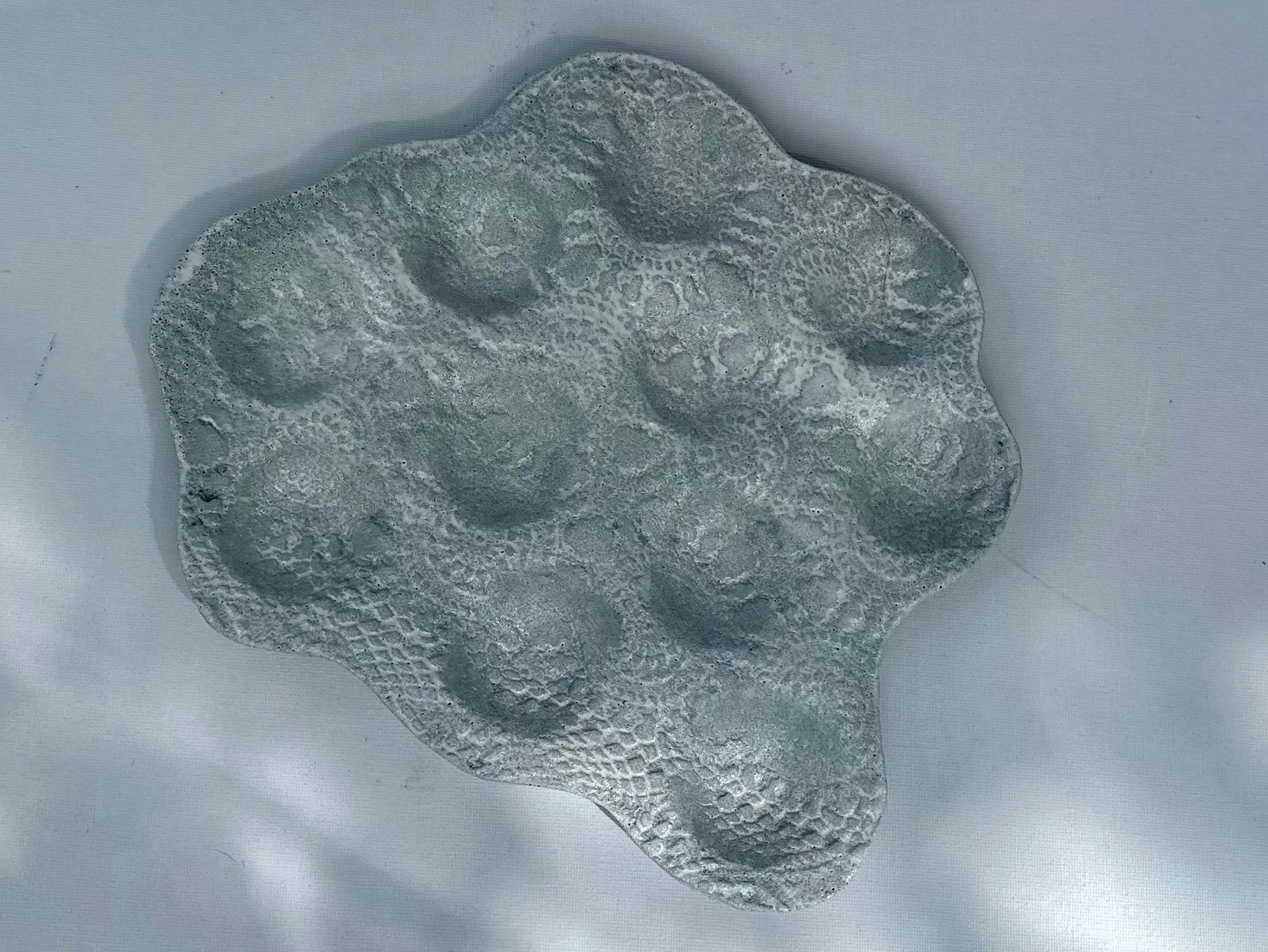 Organic shaped nesting tray, imprinted with lace on dark clay chocolate finished with matte white glaze