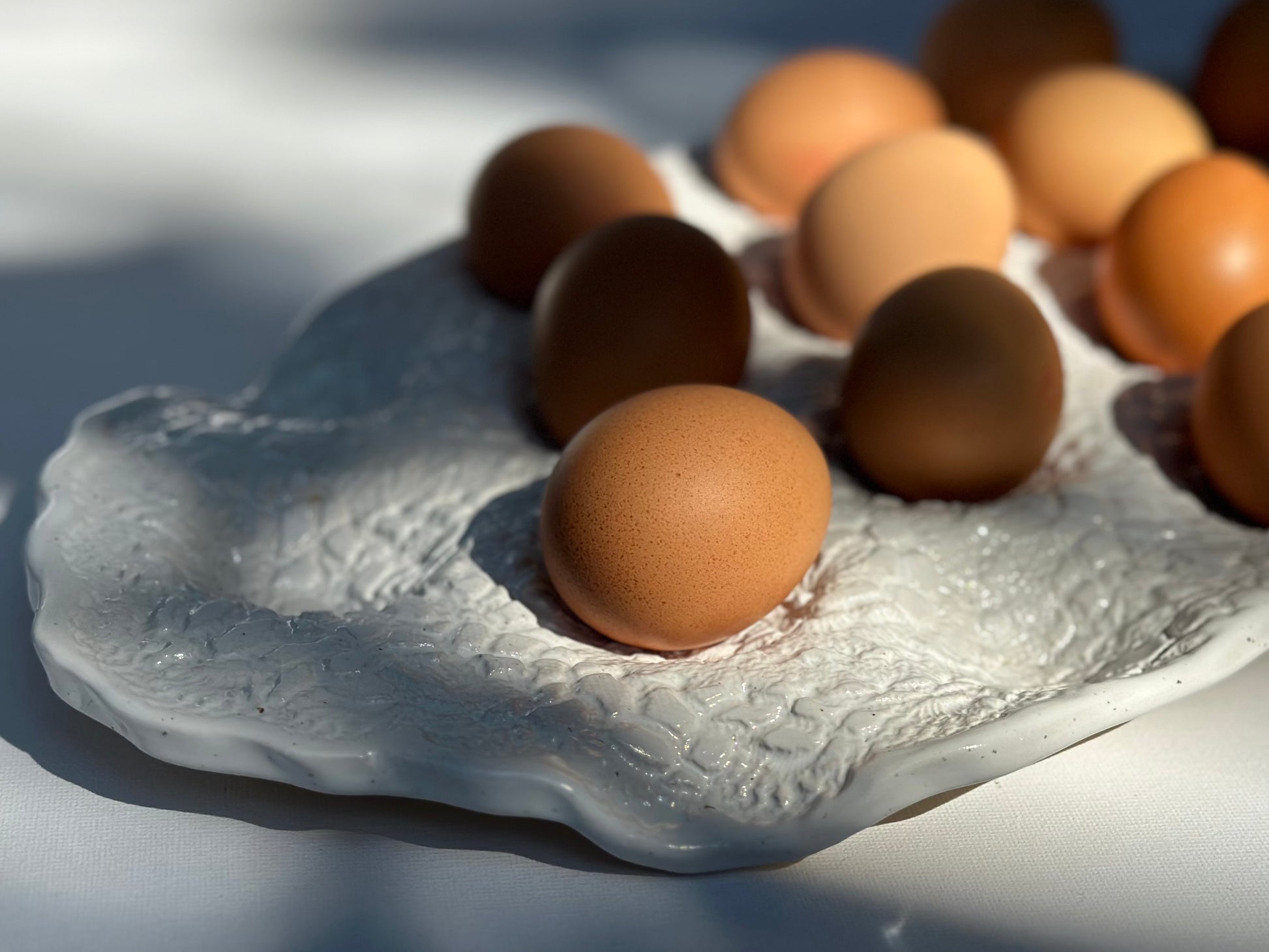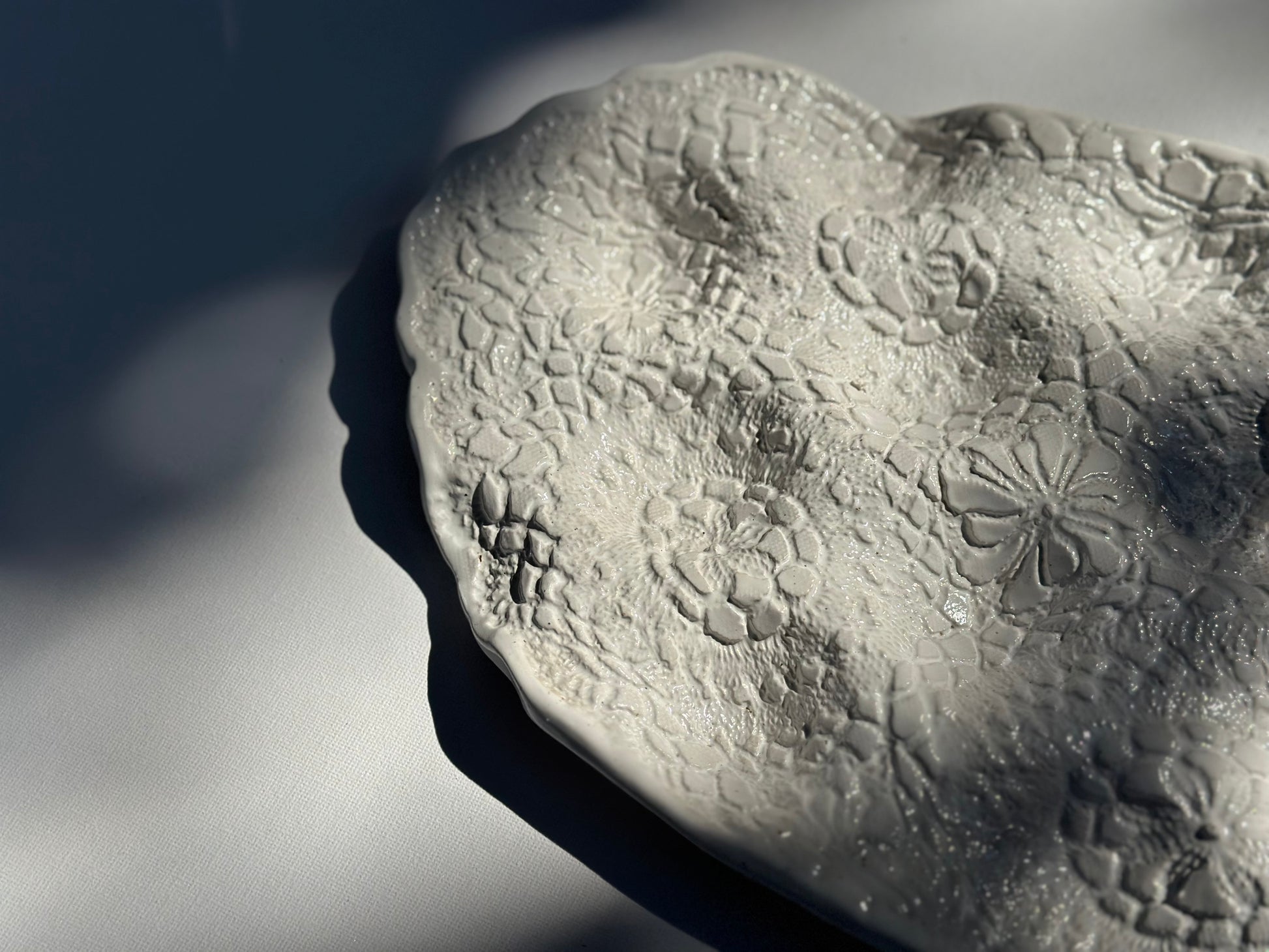 Nesting tray imprinted with entire lace doily in white matte glaze