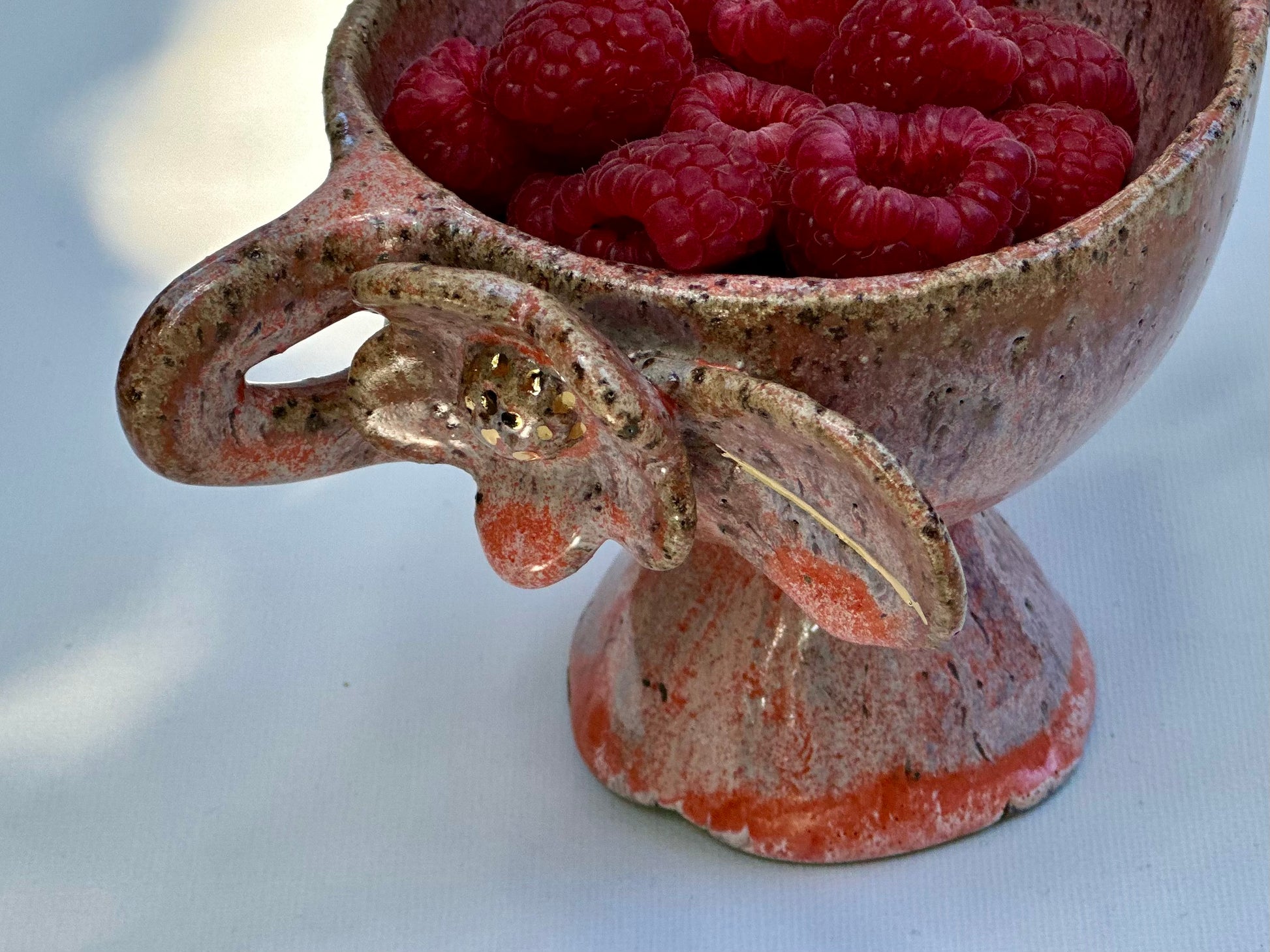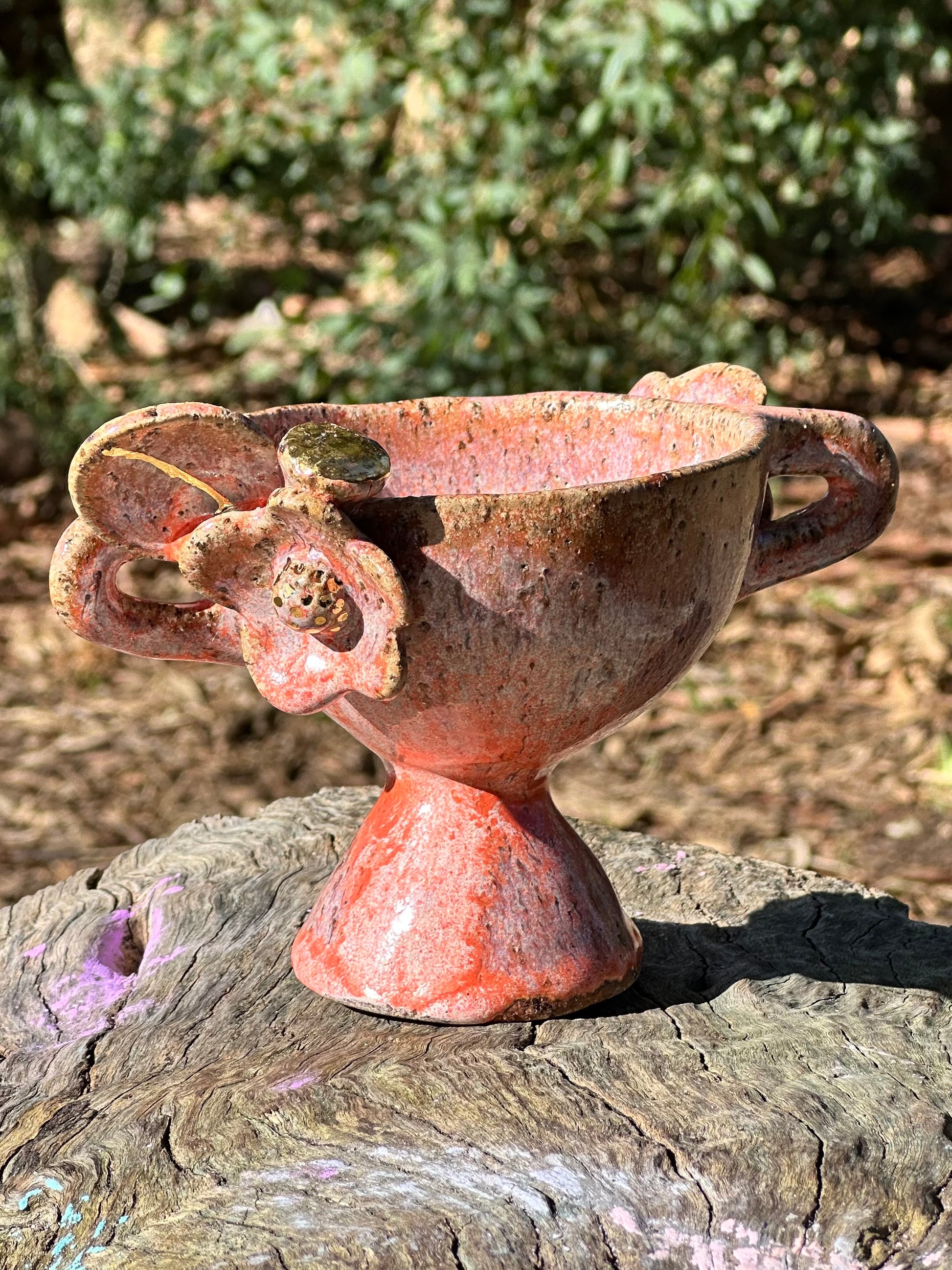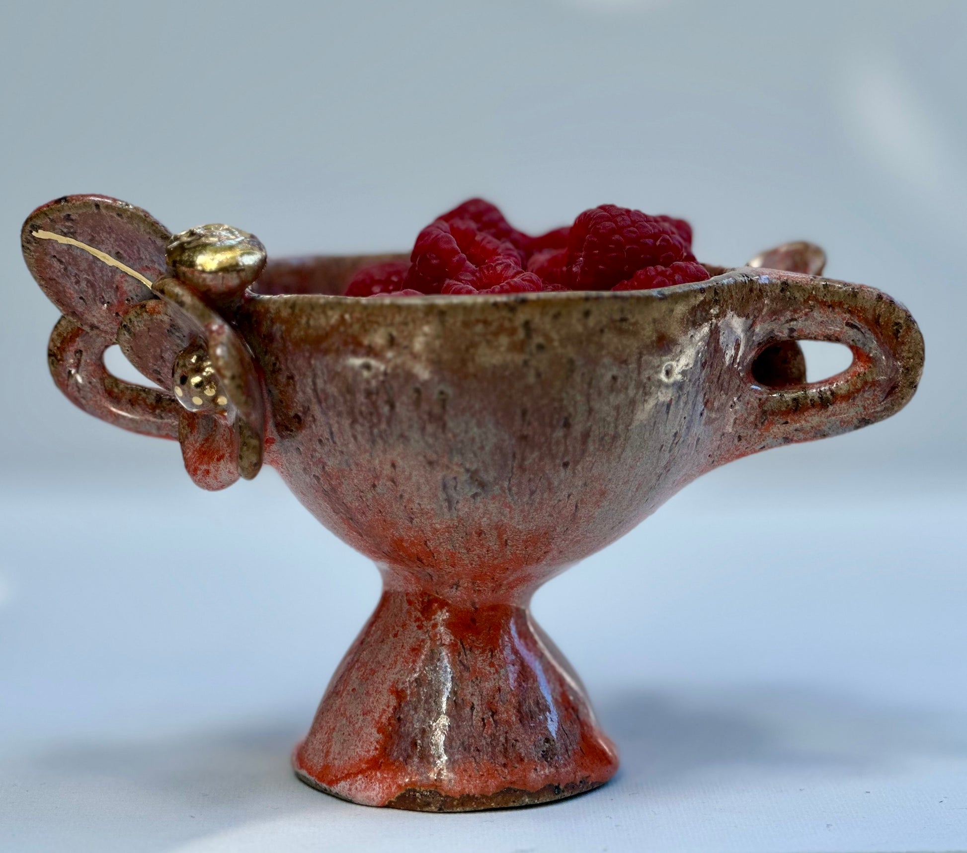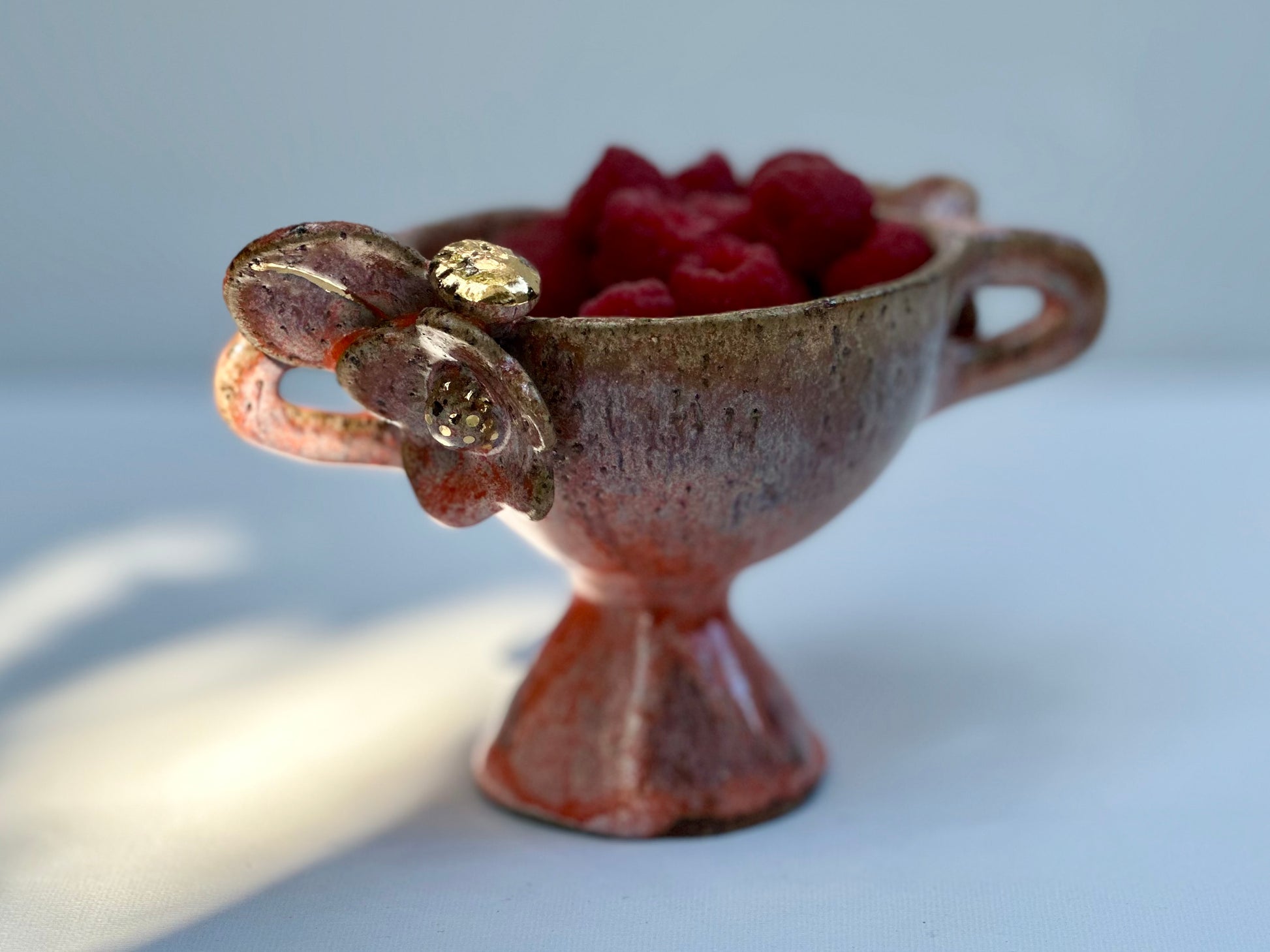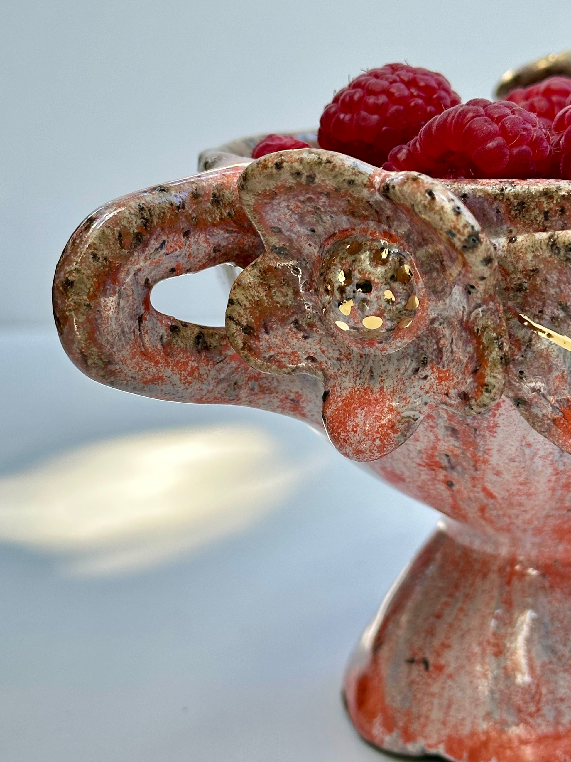 Orange and pink glaze on dark speckled clay, gold luster details on flower and leaf