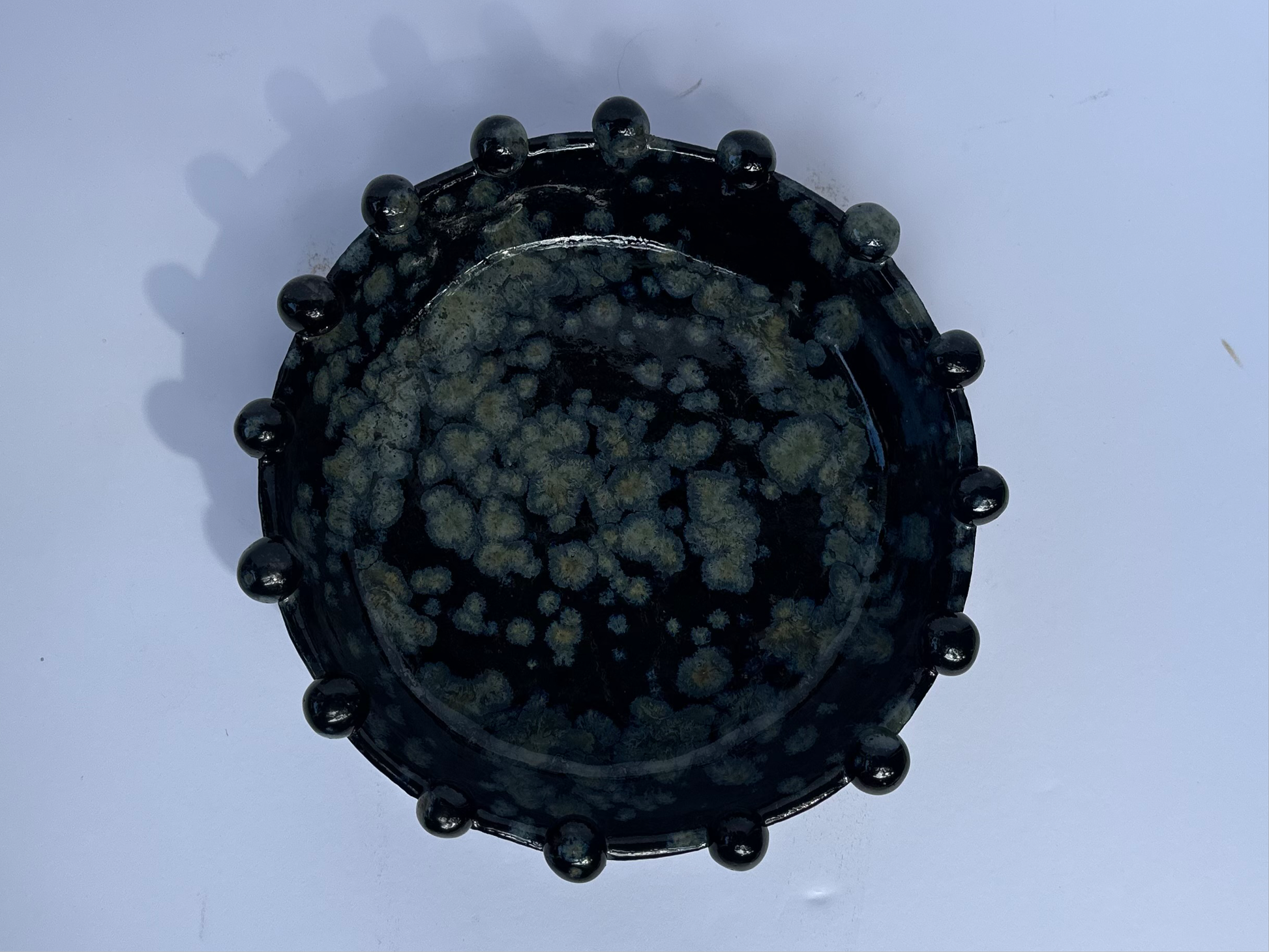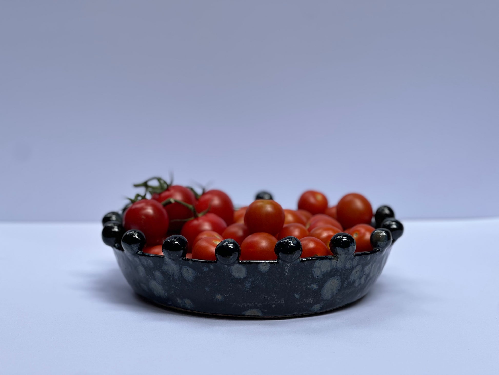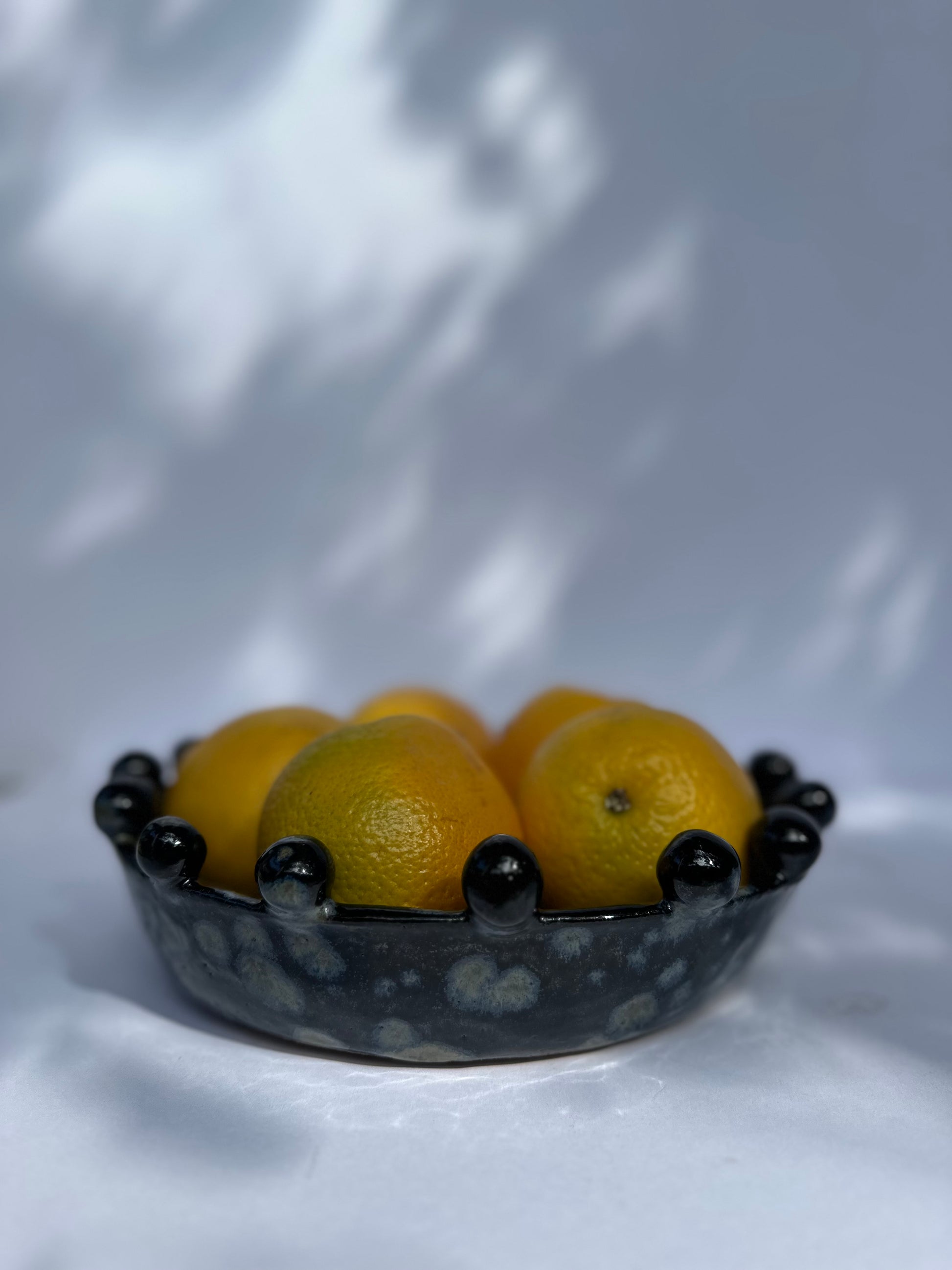 Fruit or salad bowl in a blue and black night sky glaze, special addition of small decorative balls