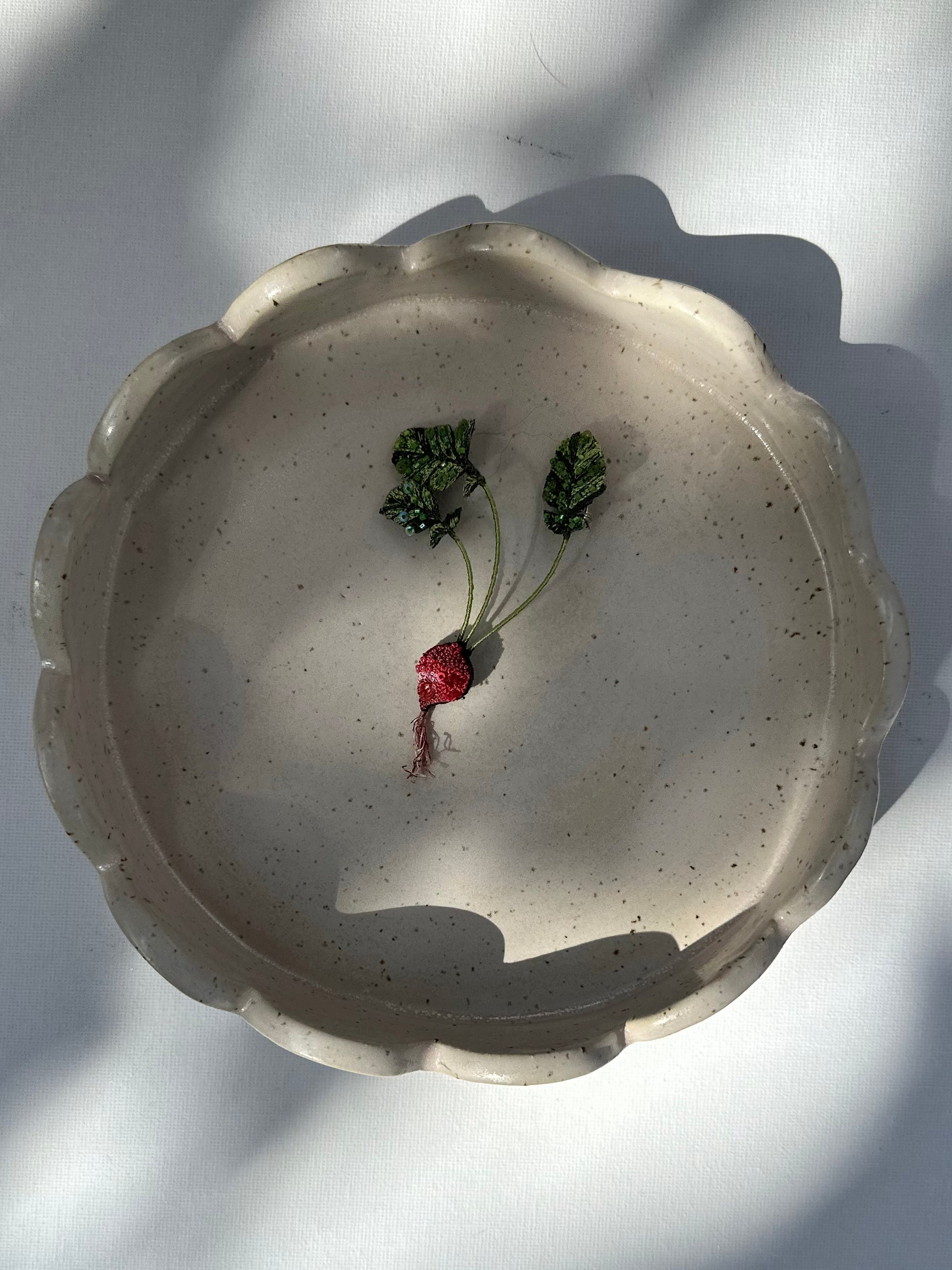 Scalloped edges surround this round tray, speckled clay in soft pink glaze