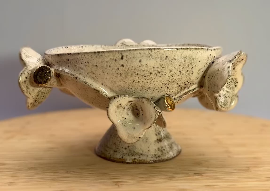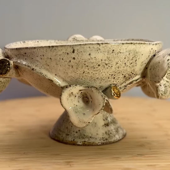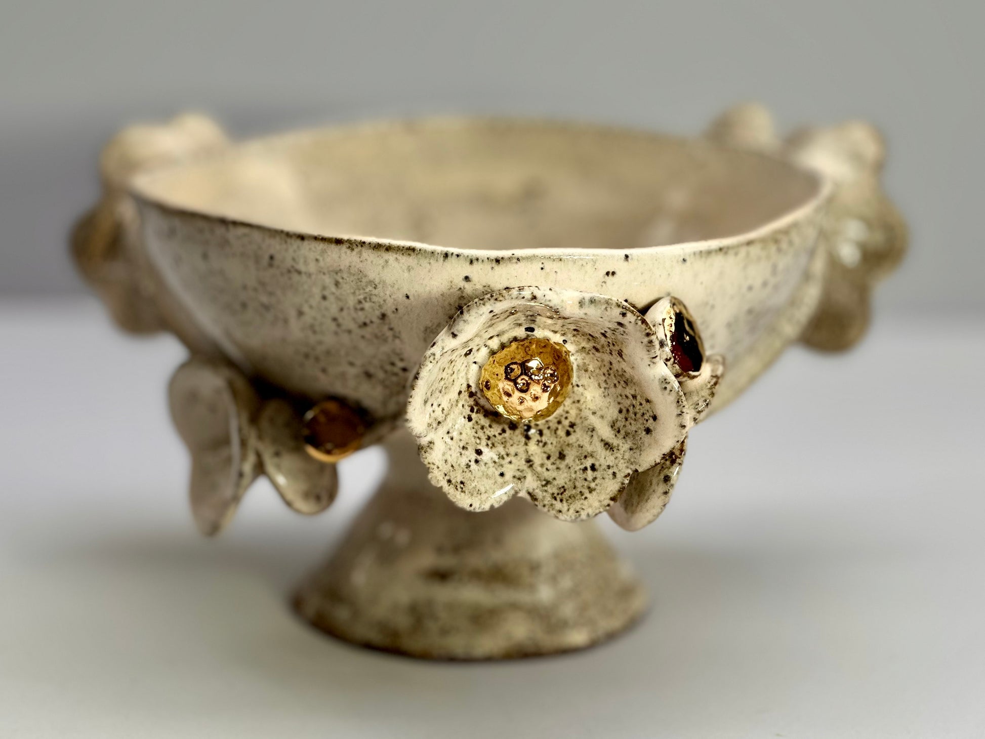 Blossom pink speckled pedestal bowl with flowers, leaves and vines accented with gold luster