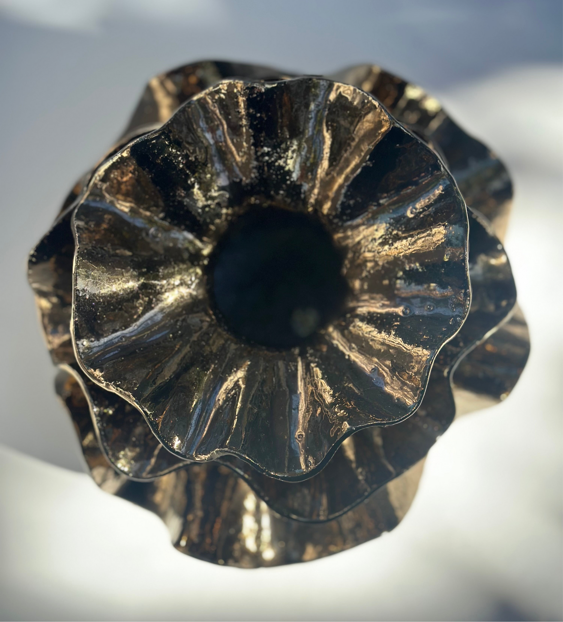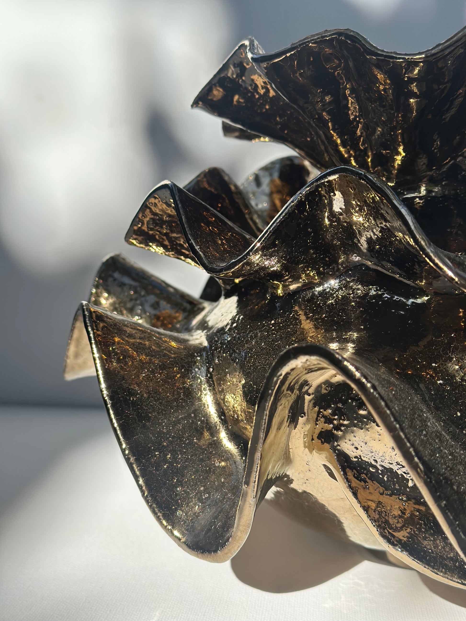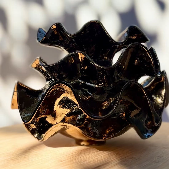 Waves of gold surround a sphere vase, internal glazed in matte black
