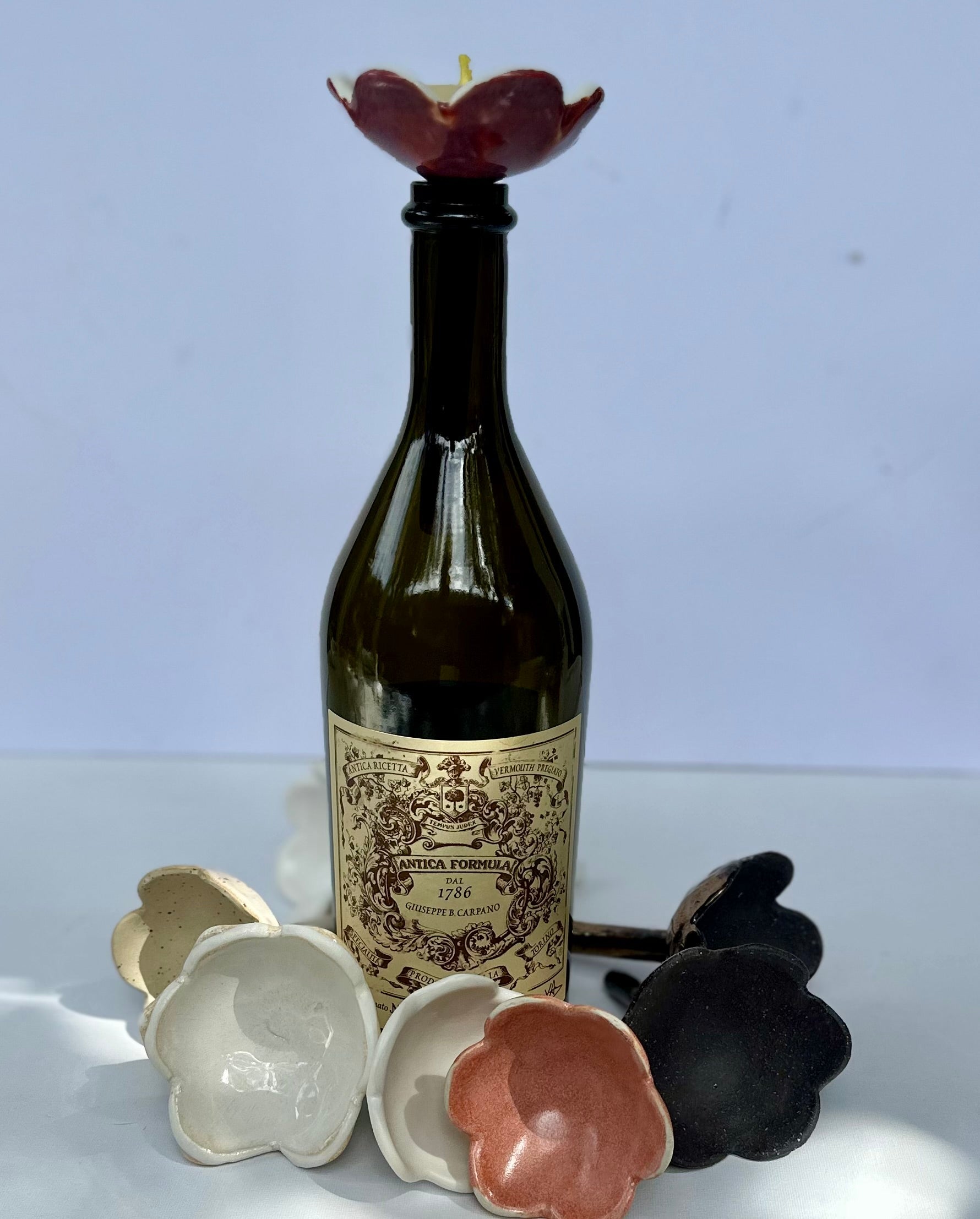 Enjoy the nostalgic candle in a wine bottle effect with these flower tea light candle holders. The stem of the flower fits into the bottle and the bloom hold the tea light candle.