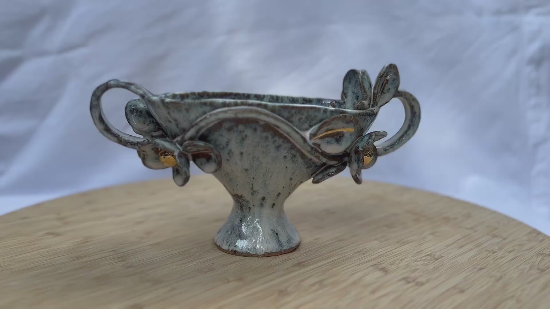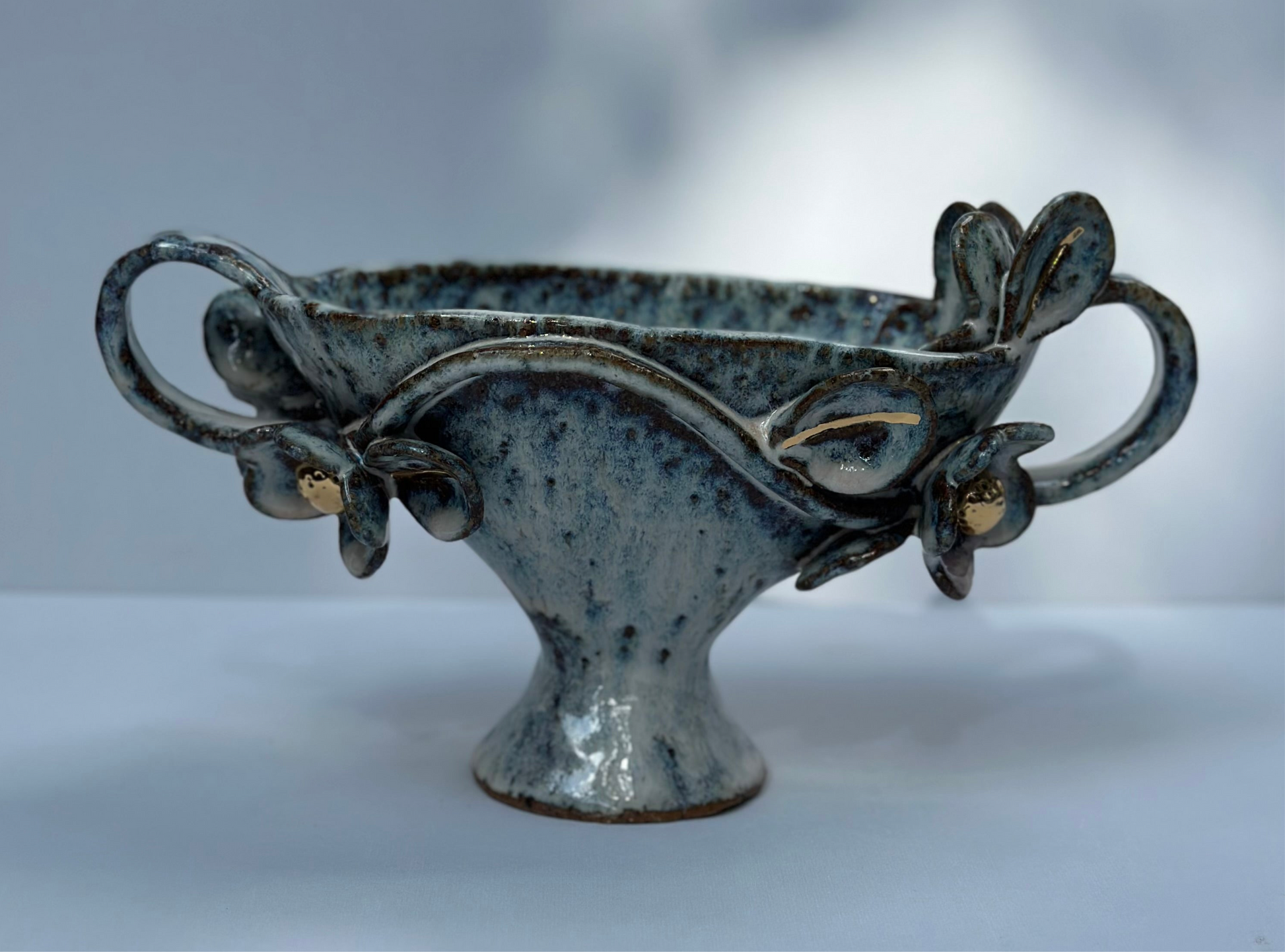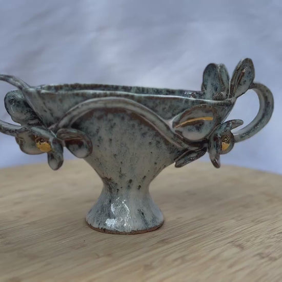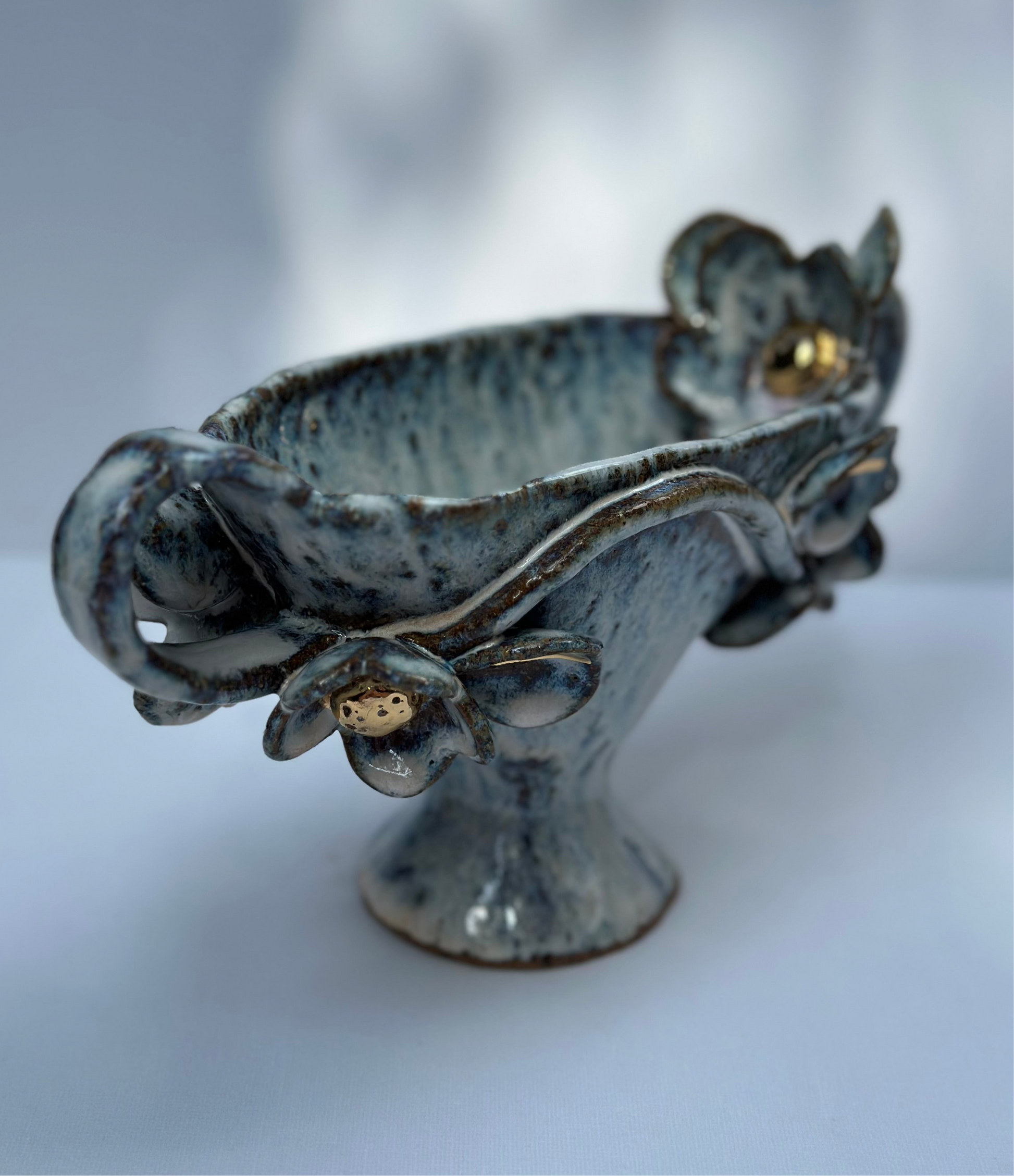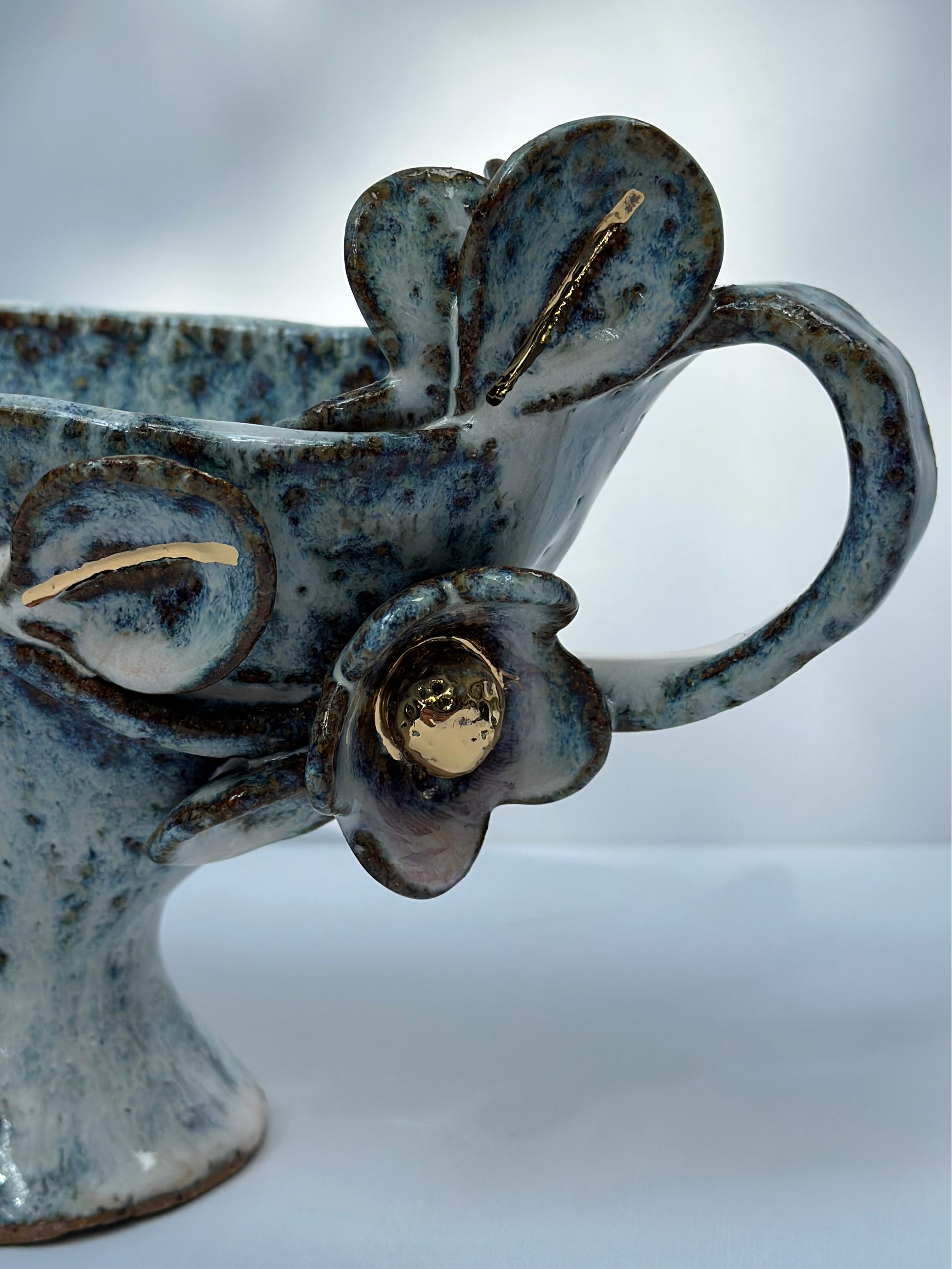 Dark clay with falling white glaze with tones of peach and blues, gold luster details on blooms and leaves