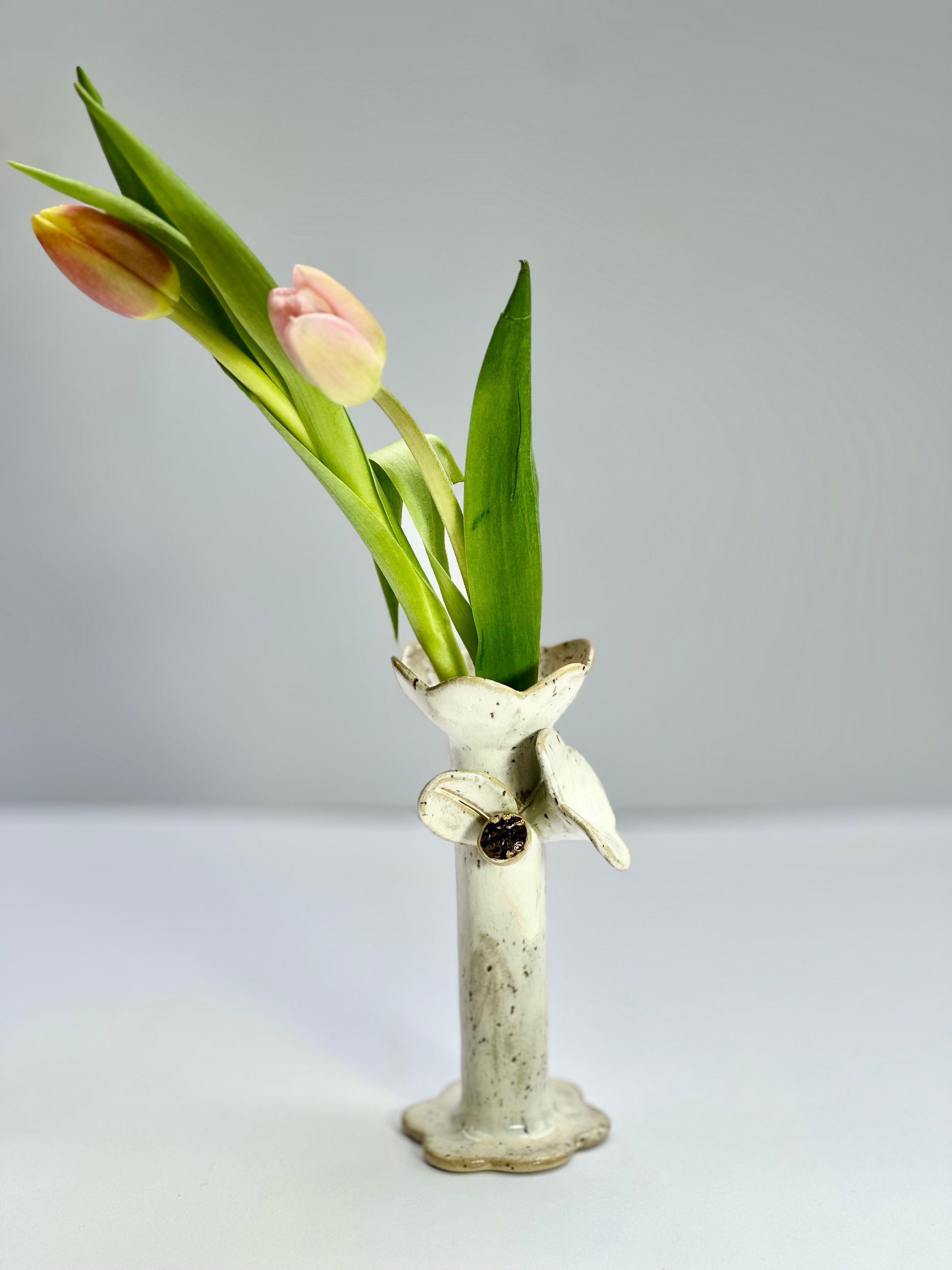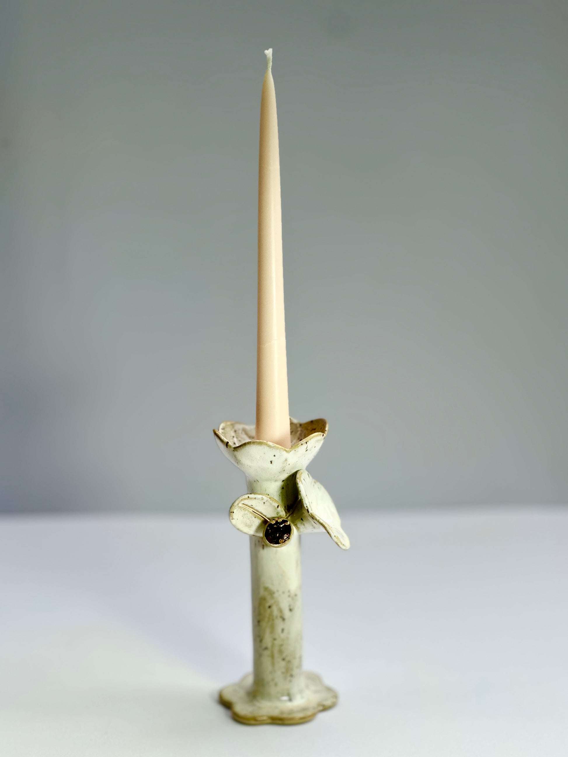Ceramic blooms and leaf touched by gold luster decorate this vase or candle holder